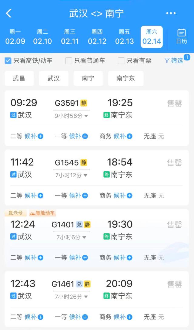 2月14日武汉至南宁的票已经售罄。图/页面截图