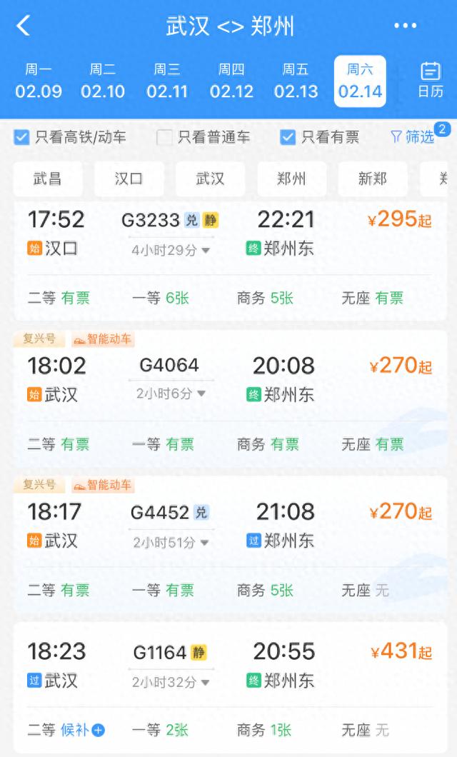 当天下午,刘女士告诉九派新闻,她要买2月14日从武汉去郑州的车票,很幸运买到了。“车次比较多,票也很多。不过五点之后有些车次的二等座也卖完了,可能不少人和我一样打算下班了就回家过年。”