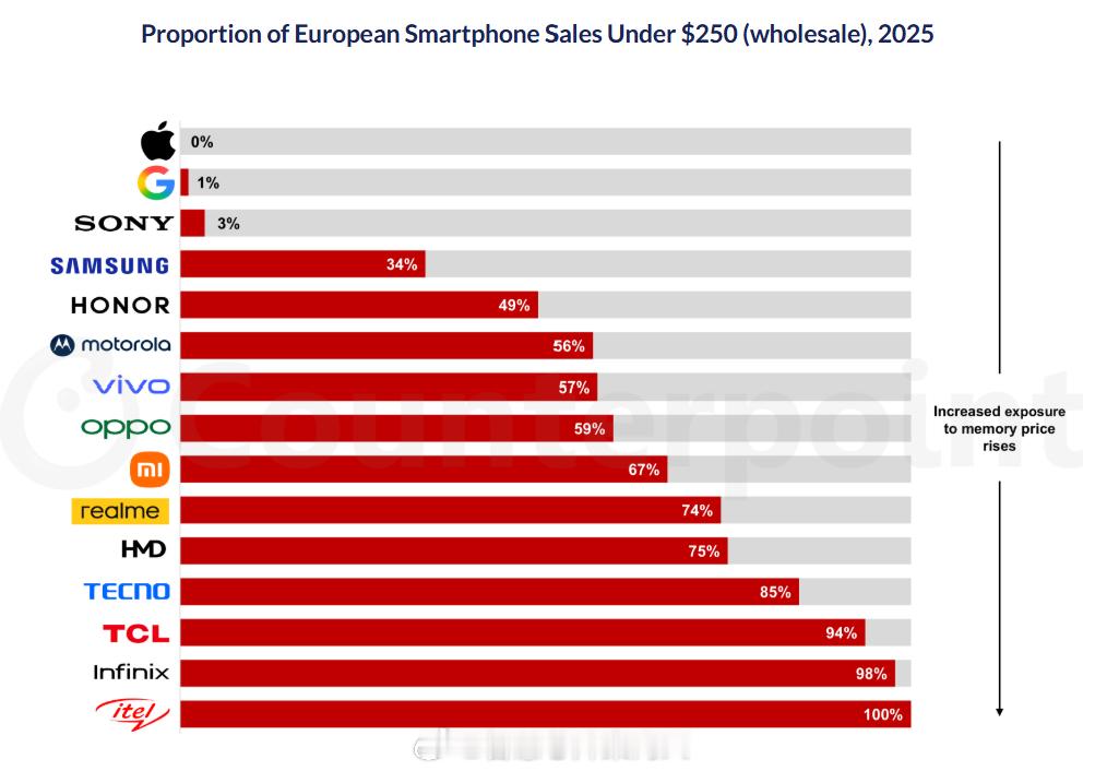 Counterpoint数据,2025Q4全球智能机ASP达到424美元,均价超过424美元的只有苹果一家。而且欧洲市场除苹果,谷歌,三星和荣耀之外,其他厂商250美元以下的手机2025年销售占比超过50%。也就是说大部分厂商都是低端手机为主。
