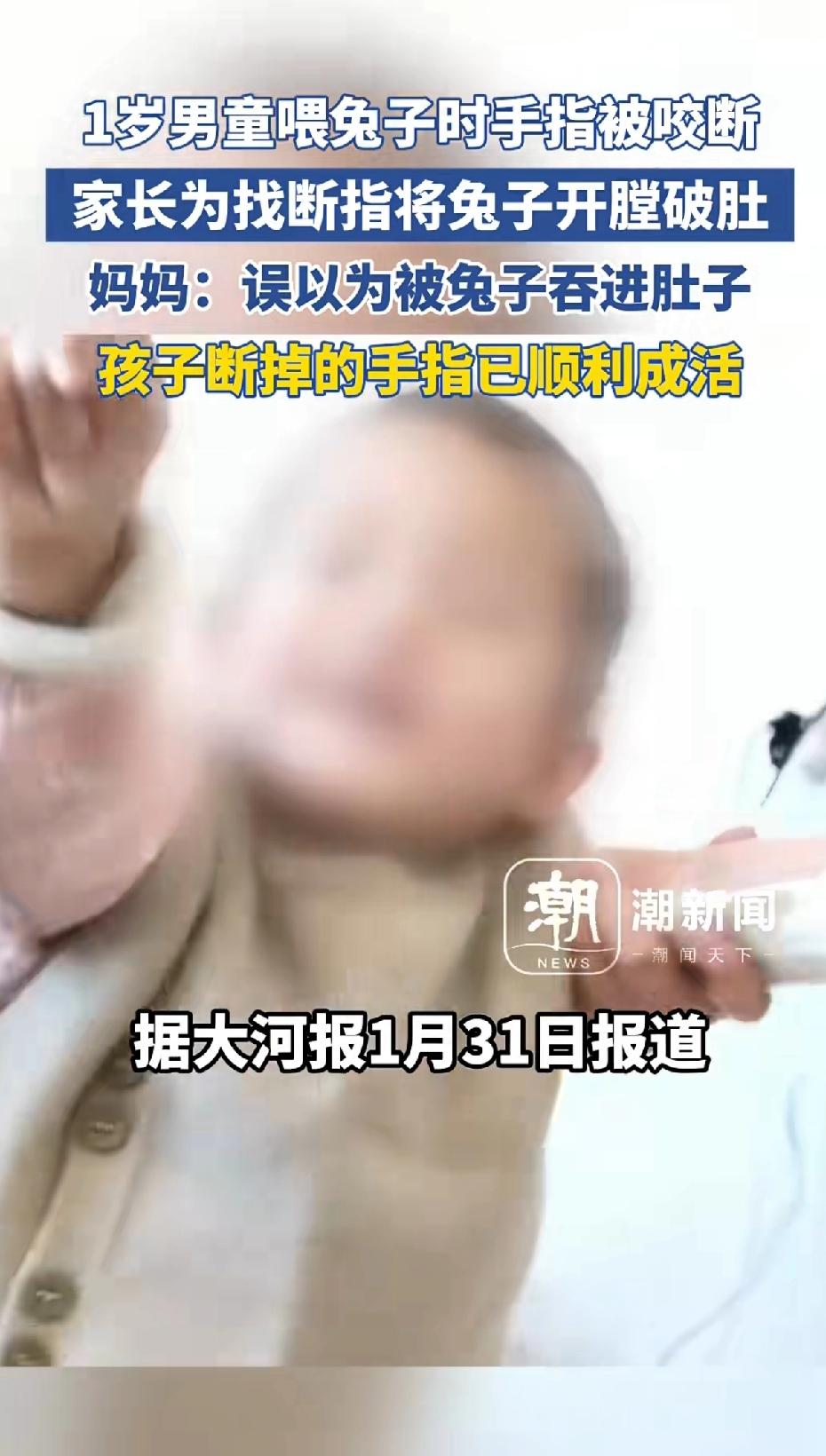 1岁男童喂兔子时手指被咬断,家长为找断指将兔子开膛破肚,并未找到断指。妈妈;误以为断指被吞进胃里。 事发时爷爷奶奶在厨房做饭,乐乐捡起茄子喂兔子,手指和茄子凑到兔子嘴边,意外就发生了。 家人听到哭声跑出来,发现孩子食指前端没了。他们以为手指被兔子吞了,急得把兔子开膛破肚,结果没找到,最后在笼子角落才发现断指。 还好家人及时带孩子去医院,手指顺利成活。即使当时在笼子里发现断指,这兔子也难逃一死,毕竟闯大祸了,只能拿命来抵。 带孩子可是需要谨小慎微的,一不小心就会发生意外。家长不可粗心大意。 医生也提醒,因宠物互动导致的儿童伤害事件不少,家长可别因动物萌就放松警惕,错误互动真可能酿成大祸。