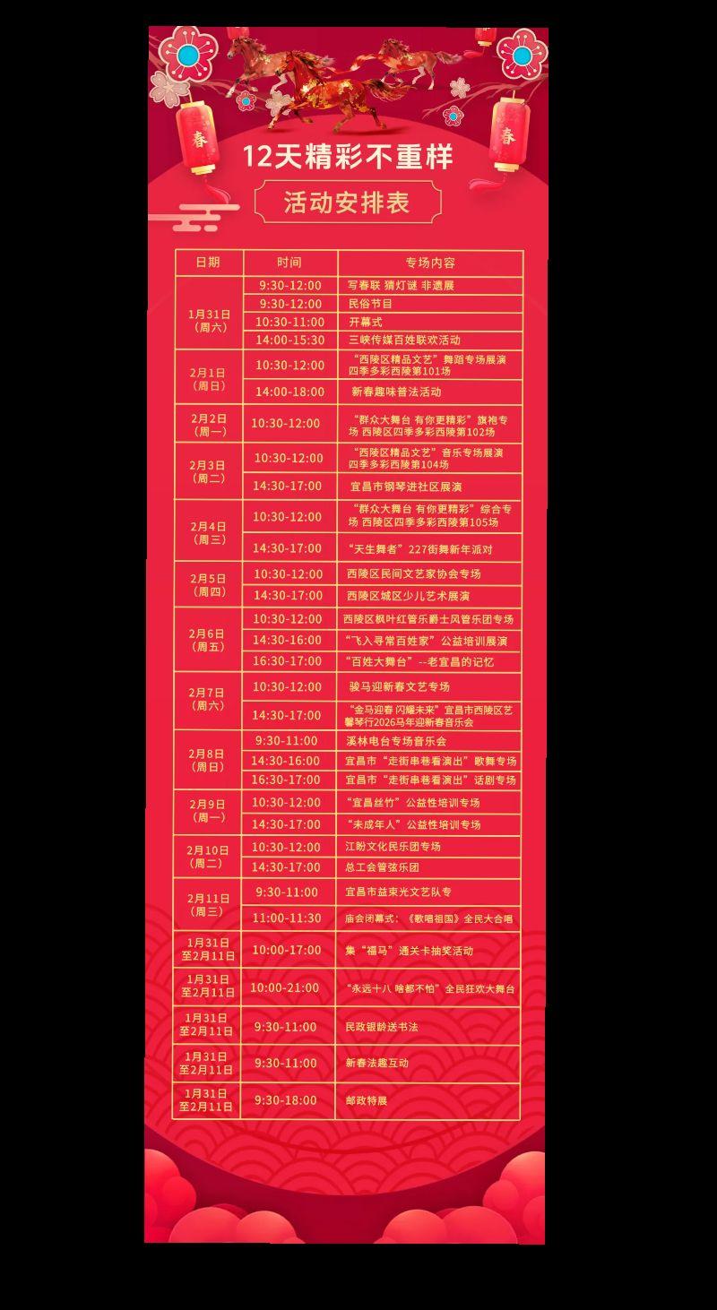 速转!第十八届宜昌西陵庙会活动安排表。生活在宜昌是幸福的,新春文化惠民活动精彩纷呈应接不暇。你是否打算带上家人,来打卡感受下浓浓的年味?宜昌 宜见钟情心动宜昌 2026 新年庙会 新春活动