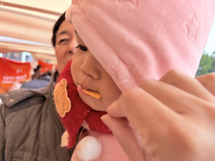 在梓桐镇的摊位前,小宝宝对试吃的玉米饼爱不释手,连吃了3块依旧嚷嚷着“还要!”“还要!”