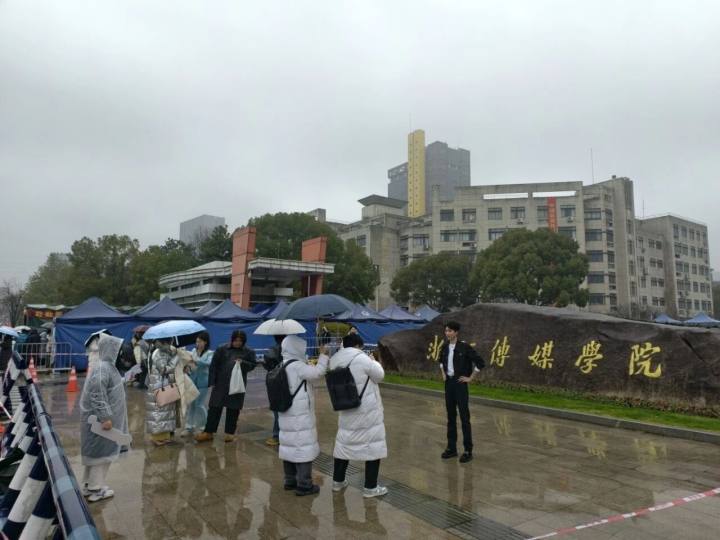 1月29日至1月31日,浙江传媒学院钱塘校区启动2026艺术类本科校考复试,校园外人潮涌动。今天是面试最后一天,但天气不够给力,从昨天开始,杭州阴雨连绵,温度也比较低,最低仅有1℃。