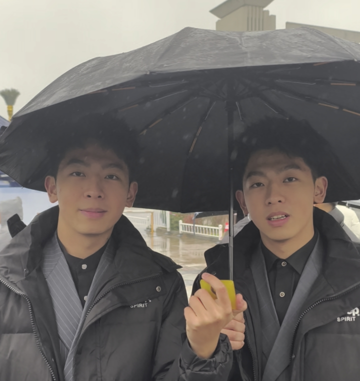 两兄弟身高有1.8米以上,穿着同款黑色羽绒服,鼻梁都很挺,笑起来特别憨厚,似乎只能靠发型做辨别,哥哥发型偏硬,弟弟发型偏软。