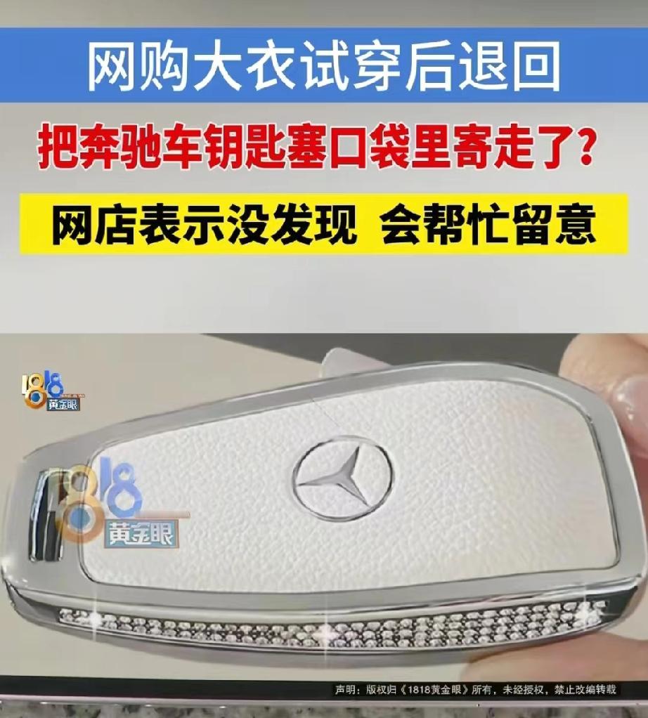 浙江嘉兴,女子花150元网购了一件大衣,到货后,她直接打开包裹在车里试穿,结果却将6000元一把的奔驰车钥匙落在了衣服兜里。试穿后她觉得袖子太短不合适,第二天叫快递小哥上门退货,车钥匙也一并退回了商家。女子发觉后赶紧联系网店老板,老板表示并未看见,但拿不出开箱视频,这下,女子不依不饶。 沈女士有一辆奔驰C260L,配有一黑一白两把钥匙,别看这么小个东西,配一把就得花上6000多块。 谁能想到,这么昂贵的车钥匙,竟因为一件百来块的大衣闹出了不小的风波。 1月3号那天,沈女士在一家网店看中了一件长款大衣,款式不错,而且只要150多块钱,她当即下了单。 1月7号晚上,她开车去快递驿站取了货,在车上就迫不及待地拆开了包裹,她把大衣往身上一套,发现袖子短了,而且质感也一般,当下就决定要退货。 一般这种情况,大部分人肯定会当场脱下来,直接拿到驿站退掉,可沈女士却觉得,晚上太冷,脱下来再重新包太麻烦了。 所以,她选择把衣服穿回家,等快递员第二天上来取件。 从车上下来,她顺手就把白色车钥匙和手机一起塞进了大衣口袋,回到家后,她只顾着从兜里掏出手机,把车钥匙的事忘得干干净净。 第二天上午9点58分左右,快递员上门来取退货包裹,还是当着沈女士的面打包的。 这件大衣寄过来的时候,快递显示重量是1.2千克,包装也很简单,就一个塑料袋,可等沈女士寄回去的时候,快递显示的重量变成了1.69千克。 后来,她专门找人称了一下同款奔驰车钥匙的重量,大约是53.3克,而且沈女士的钥匙上还贴了装饰物,这重量差刚好能对上。 1月10号,沈女士打算出门用车,这才发现白色车钥匙不见了,她把家里和车里翻了个底朝天,还是没找到钥匙的踪影。 这时候,她才猛地想起,那天把钥匙放进了大衣口袋,跟着包裹一起寄出去了。 这把要是可不便宜,要6000多块,沈女士心急如焚,赶紧联系了网店客服,客服回复说,没见过什么车钥匙。 客服还解释说,当时拆包裹的是个临时找来的阿姨,既没有开箱视频,也没有入库视频。 沈女士让客服把自己那件大衣找出来拍个照,客服没有照做,这下,沈女士不高兴了,她觉得,自己粗心大意有责任,但商家拿不出能证据证明自己的清白,也应该担责。 后来,沈女士还将此事反映给了记者。 随后,记者联系了网店工作人员,对方也满肚子委屈,她表示:店里每天要处理上百件衣服,退货回来的衣服都是大姐负责整理,收拾好第二天就又发出去了。 整理的时候,大姐们一般都会摸摸口袋,检查一下,但有时候难免会有遗漏,之前也有顾客收到衣服,从口袋里摸出纸巾、口罩的情况。 要是真看到车钥匙,他们肯定会还给沈女士,毕竟他们留着这钥匙也没用。 而且,暂时还没有顾客反馈,说从衣服里摸到了钥匙,但是他们会继续帮忙留意。 平台那边得知情况后也回复说:会积极协调沟通,尽量保障双方的权益。 只是退货的环节实在太多了,现在根本没法确定车钥匙到底丢在了哪个环节。 直到现在,沈女士的车钥匙还是毫无下落,她只能耐心等待 对于沈女士的说辞,不少人表示质疑,谁会傻乎乎地在车里试长款大衣,根本看不出啥效果,她肯定是穿出去溜达了一圈才退货的。 还有人惊讶,开奔驰这么有排面的人,居然还买100多块钱的大衣,真是让人意想不到。