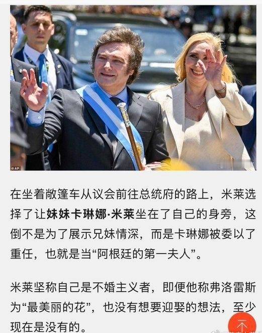 阿根廷总统米莱:西装配跑鞋,妹妹当“第一夫人” 阿根廷总统米莱又整活了!和特朗普握手那张图火了——人家特朗普一身笔挺西装、亮面皮鞋,他倒好,西装配跑鞋,裤脚还卷着,这画风直接跑偏。 更绝的是,作为不婚主义者,他干脆让亲妹妹卡琳娜代行“第一夫人”职责,还把她提拔成总统府秘书长,私下喊她“老板”。 这波“混搭”操作,有人骂是裙带关系,有人夸是真性情。 但对米莱来说,穿跑鞋是为了接地气,用妹妹是为了信得过,毕竟在阿根廷,“真实”比“正确”更能打动选民。 你觉得这是真性情还是在作秀? 国际