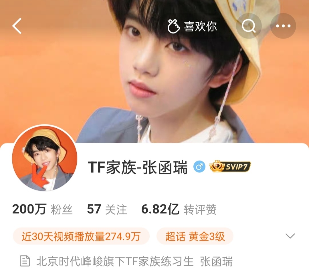 张函瑞微博粉丝破200万恭喜张函瑞微博粉丝数破200万💥人气与实力双在线出场即