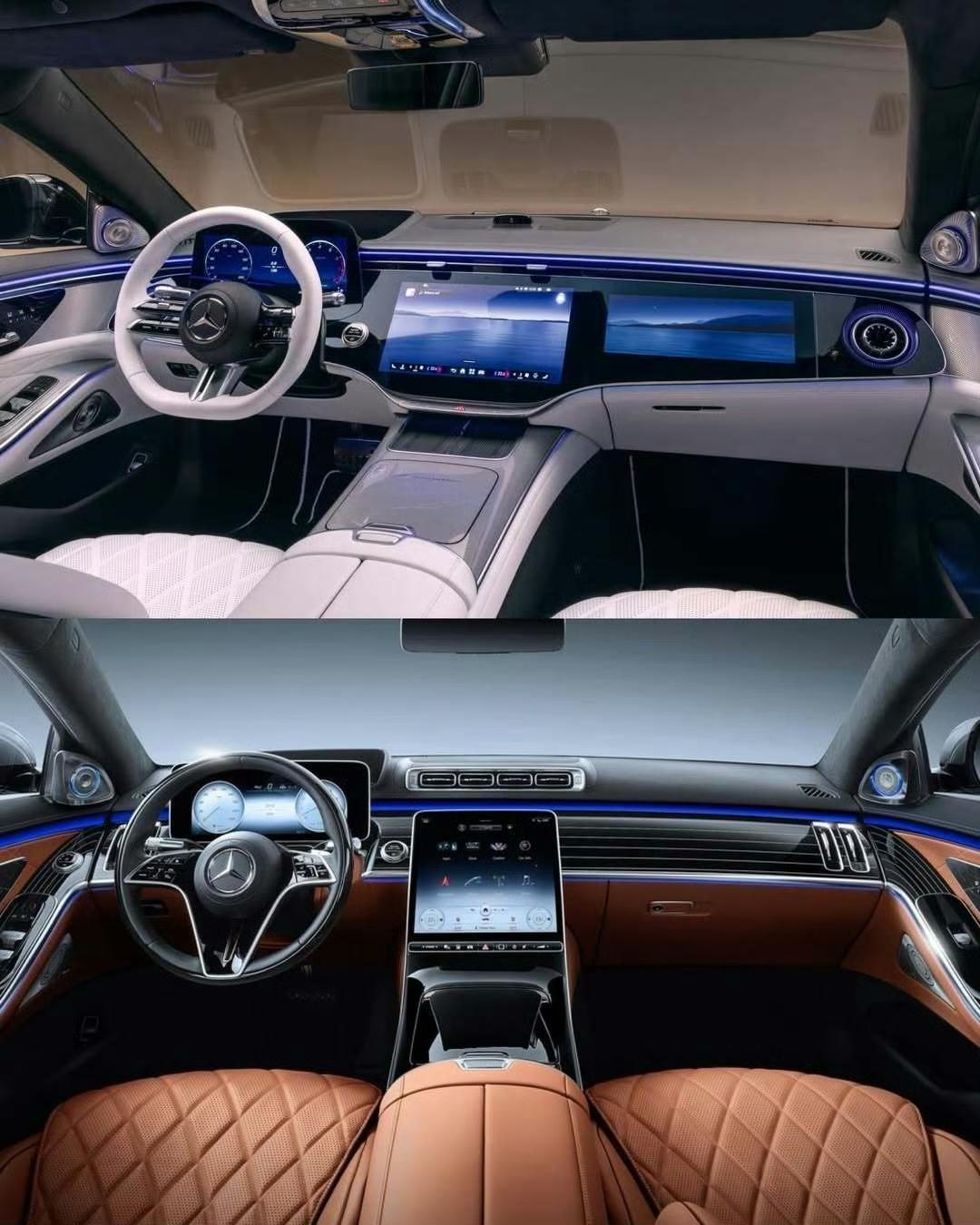 中期改款S级和现款一对比,那气势提升可不是一星半点。就说设计语言,感觉它就是现款E级的完全体。现款E级设计已经挺出彩了,但中期改款S级把那些亮点发挥到极致。 它的星徽含量超高,星徽元素在车身上多处体现,比如中网的星徽式布局,在阳光下一闪一闪,特别吸睛。整体线条更硬朗大气,车头更具冲击力,开在路上那气场直接拉满。相比之下,现款就显得稍微收敛了些。不得不说,中期改款S级在设计上又上了一个新台阶。