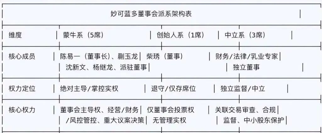 董事会的权力结构变化更是直观,在目前的董事会中,蒙牛系占据了绝对主导地位,而创始人柴琇仅剩一席董事之位,失去了经营管理实权。当导火索事件发生,柴琇未能履行承诺时,蒙牛顺理成章地启动了免职程序,完成了对妙可蓝多的全面接管。