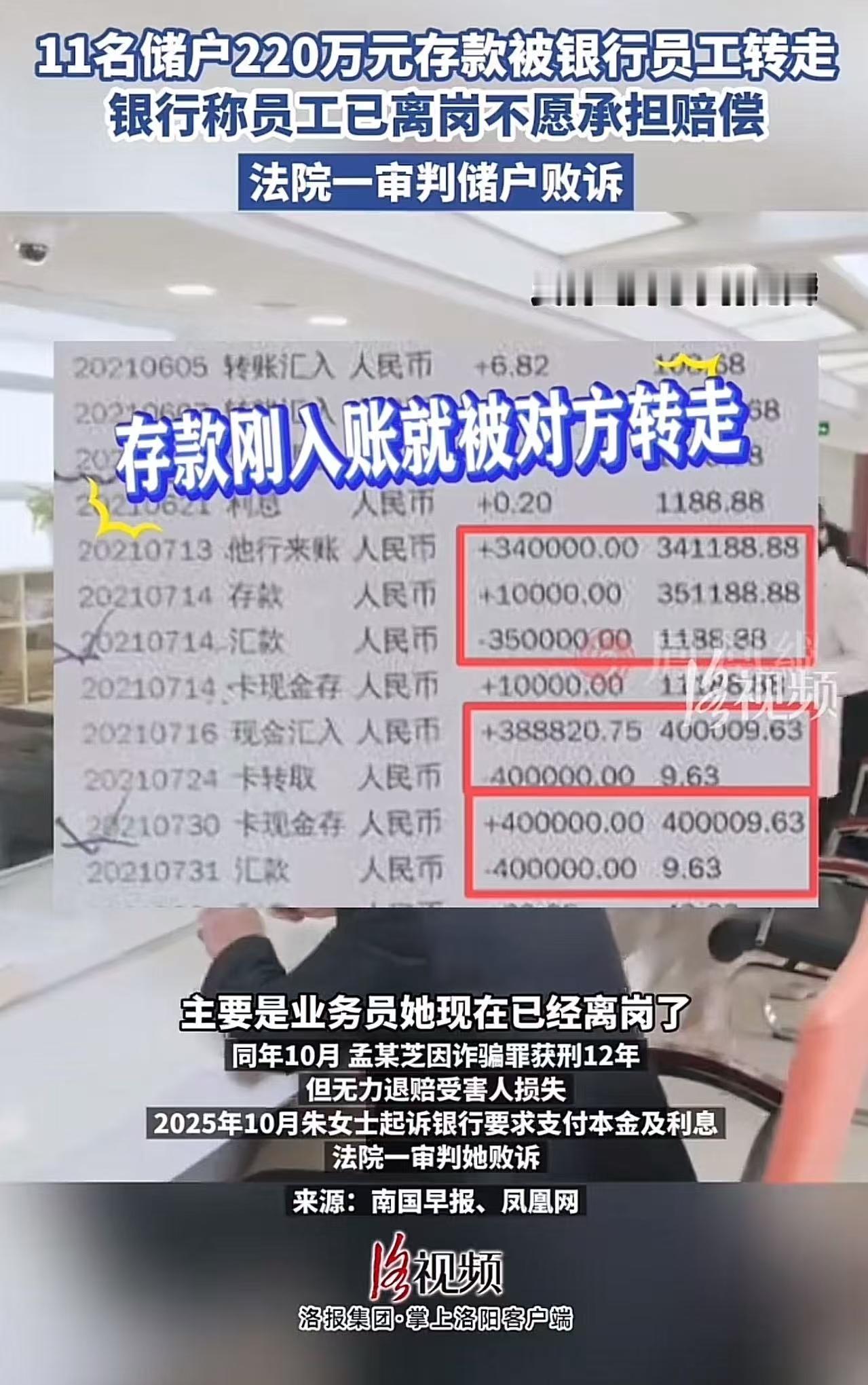“这样谁还敢把钱存银行?”内蒙古呼伦贝尔,女子将75万存入银行,那是她攒了一辈子的钱,以为放银行最安全,可是万万没想到,柜员压根没把钱存入她的账户,而是偷偷转走! 更离谱的是被骗的不止她一个,足足有11个人,合计220多万! 朱女士,攥着那张薄薄的判决书,站在法院门口,浑身发抖,眼泪止不住地往下掉。 她不是哭自己倒霉,而是哭这辈子攒下的75万血汗钱,一夜之间成了别人账户里的数字,而那个穿制服、戴工牌、笑眯眯叫她“阿姨”的柜员,竟把她当成了提款机。 这75万,是她和丈夫省吃俭用三十多年的全部积蓄。年纪大了,她怕放家里不安全,更怕被骗进非法集资,于是选择把钱存在银行。 “我特意选了大银行,觉得最安全。”朱女士哽咽着回忆,“那天柜员孟某芝特别热情,还给我倒水,说‘阿姨您放心,钱放我们这儿,比放家里牢靠一百倍’。” 她清楚记得,自己亲手把存折和身份证递过去,眼睁睁看着孟某芝在电脑上操作。对方一边点鼠标,一边说:“钱存在我们这边,利息比普通高不少。你需要取钱的话,提前和我说。” 朱女士没多想——人家穿着银行制服,坐在银行柜台里,用的是银行的系统,连打印出来的回单都盖着银行的章。她怎么也不会想到,那笔钱根本没进她的账户,而是被悄悄转到了孟某芝控制的私人账户。 更让她崩溃的是,事后去银行讨说法,工作人员冷冷一句:“这是孟某芝个人行为,她已经离职了,银行不承担责任。建议您去起诉她。” “个人行为?”朱女士几乎吼出来,“她不是你们的人吗?她不是在你们柜台上班吗?她要是穿个便装站路边,我会把75万给她?” 后来她才知道,像她这样的受害者,还有11人,总计220多万元,全是普通人用命换来的钱。 而孟某芝,利用柜员身份,在2018年到2023年间,以“高息理财”“内部存款”为名,系统性诈骗,把钱拿去放贷、还债、挥霍。案发后,她被判刑12年,但名下无任何资产,退赔?等于零。 朱女士不甘心,把银行告上法庭,要求兑付本金及利息。 可一审法院认为:孟某芝虚构理财产品,储户未尽审慎义务,签字确认了转账操作,银行无过错,不承担赔偿责任。 拿到败诉判决那天,朱女士瘫坐在法院台阶上,喃喃自语:“我一个老太太,哪懂什么系统、什么流程?我只知道,那是银行,是国家开的……我以为,只要踏进那个门,钱就安全了。” 此事在网上掀起滔天巨浪: 有网友说,“银行员工穿制服、用系统、在柜台作案,这叫‘个人行为’?银行工作人员也是代表银行的不是某个人的,顾客存钱是到某个银行,所以柜员拿的是银行的钱,不能把银行的损失转嫁给储户,不知法院的思路是什么。 也有网友说,从证据来说,银行好像确实没有责任,估计签字的人啥都没看就签字了,那就是你自己同意把钱转到别人账户了。法院怎么判?判银行有责任,那其他人都可以不认自己签过的东西了,那不也会造成混乱嘛! 还有网友说,“关键要看操作是否通过银行正规系统。如果是柜员绕过系统私下转账,银行或可免责;但若用了银行系统完成资金划转,银行必须担责!” 当一位老人把毕生积蓄交给银行,她交付的不仅是钱,更是对国家金融体系的最后一份信任。 而银行一句轻飘飘的“系员工个人行为”,不仅推卸了监管责任,更亲手砸碎了公众对“银行=安全”的基本信仰。 法律不能只盯着储户有没有“仔细看签字”,更要追问: 为什么一个柜员能连续五年挪用客户资金而不被风控系统拦截? 为什么“高息理财”能堂而皇之在柜台推销? 为什么银行的事后补救,只是开除一人、撇清关系? 真正的风险,从来不是储户的“轻信”,而是金融机构把“信任”当成理所当然,却把“责任”藏在格式条款之后。 若此案最终仍由受害者承担损失,那未来每个走进银行的人,都该先问一句:“你们的制服,到底是信誉的象征,还是犯罪的伪装?”