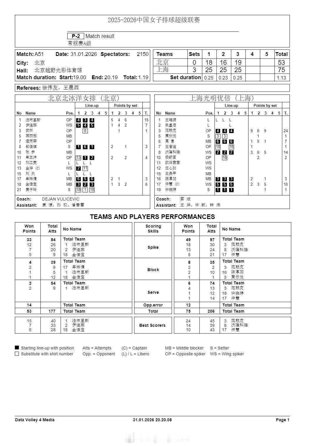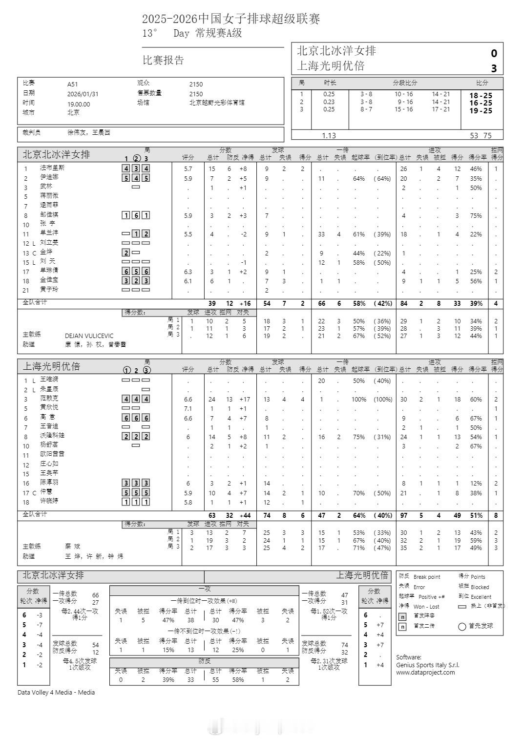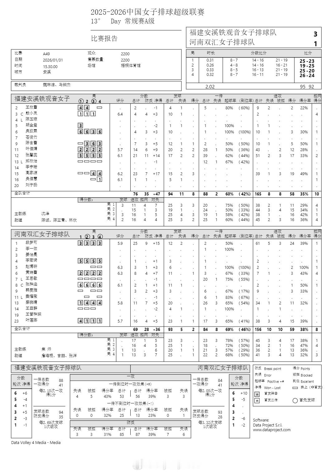 排超联赛 1月31日,女排联赛技术统计。