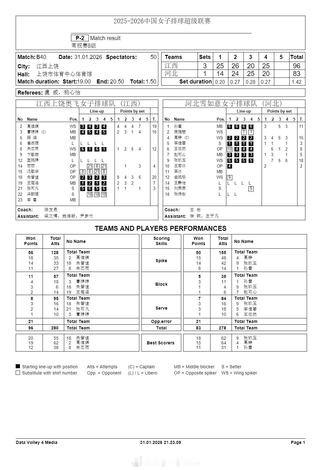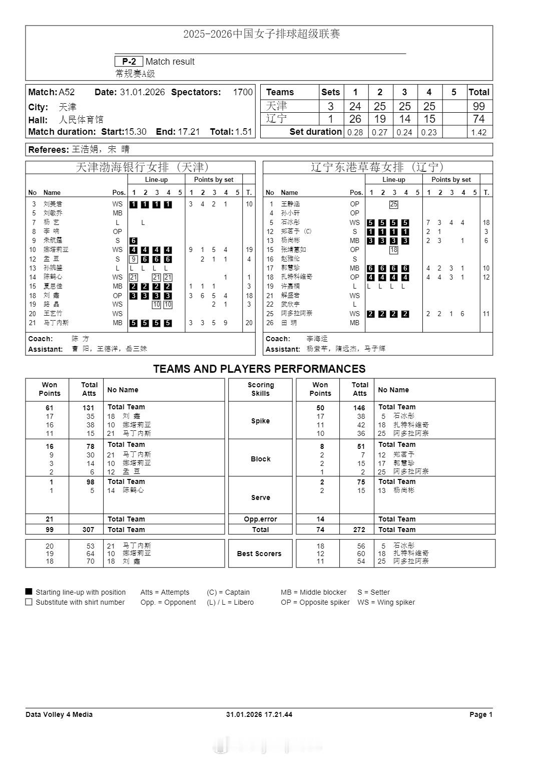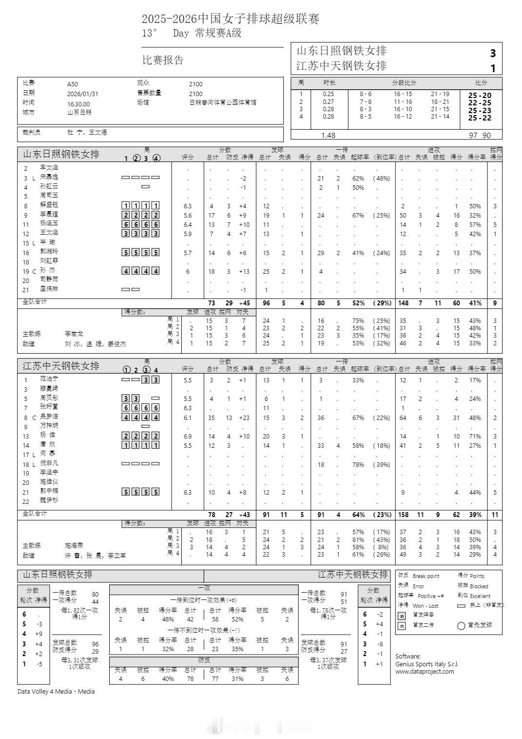 排超联赛 1月31日,女排联赛技术统计。