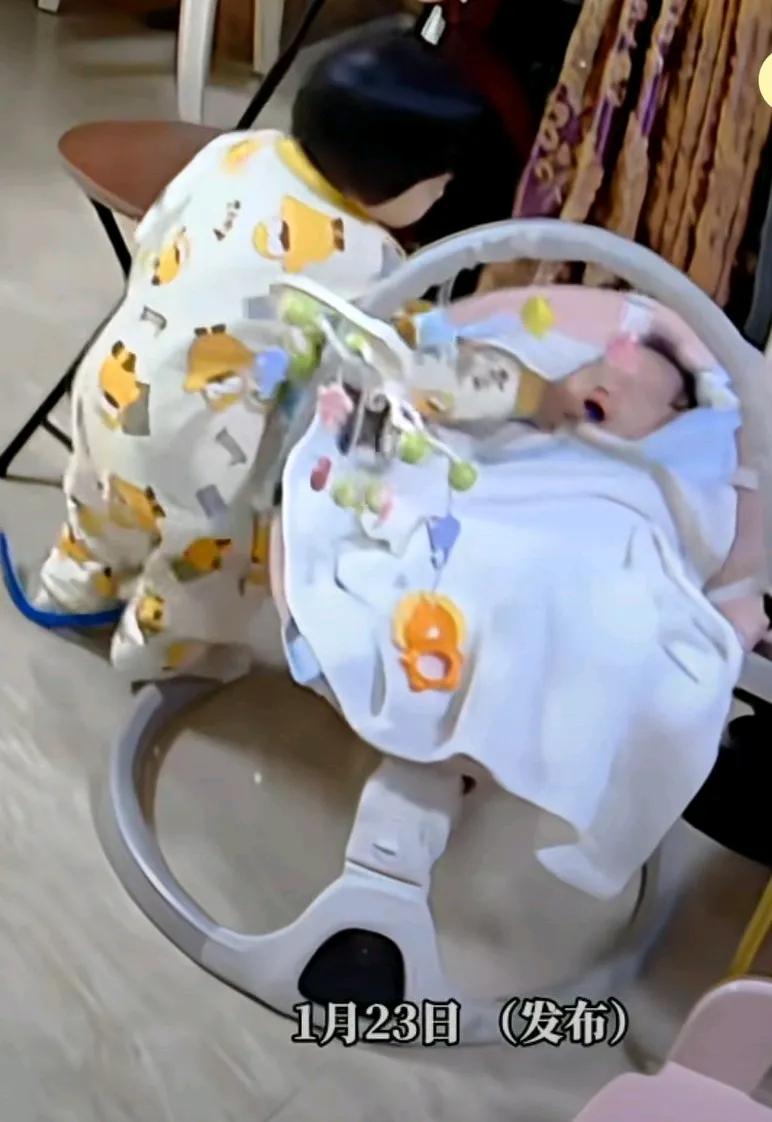 姐姐把管子塞进二宝喉咙里,致使宝宝呛奶, 妈妈可能是在里边上厕所听到动静, 赶紧跑过来抱起二宝, 并且伸手打了一下姐姐, 大宝年龄也不大, 但是好奇心不应该这样, 网友说,必须狠狠的打一顿,长长记性, 要不还会有下一次。 有人说这么小的孩子, 根本不知道自己在干什么, 有的说三岁已经知道善恶, 是心眼儿坏。