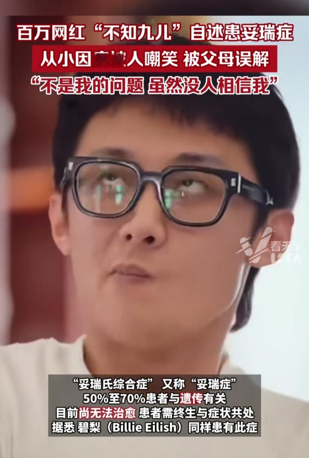 你有没有见过这样的人?控制不住地抽动、发出奇怪声响,被旁人当成调皮捣蛋,甚至被贴上“不正常”的标签。他们藏起自己的“不一样”,在异样的眼光里活得小心翼翼,满心委屈却无人能懂。 网红“不知九儿”就是如此。他从小被误解,被误诊为多动症、智力缺陷,承受了太多嘲笑与排挤,一路自卑又迷茫。直到2020年,一部《嗝嗝老师》让他知晓,自己不是“怪胎”,是得了罕见的妥瑞氏综合症。 这种病50%至70%和遗传相关,目前还无法被治愈,患者得终生与症状共处。如今九儿靠着分享经历收获千万粉丝,他想告诉所有人:那些不同从来不是羞耻,多一份理解,就少一个被偏见困住的人。