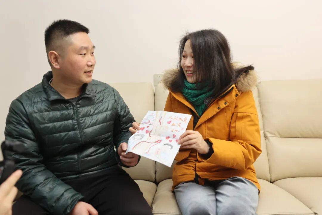 其中一份礼物,是她女儿用A4纸为捐献者画的画。封面是孩子手绘的红心和小花,用彩笔写着“感恩有您”“谢谢杨叔叔”,“因为孩子知道,没有杨叔叔,就没有妈妈了,就没有我们家了。”她说。