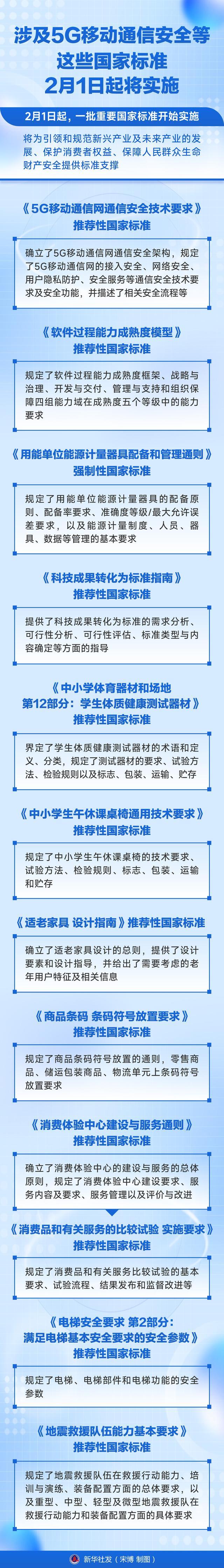 2月1日起,涉及5G移动通信安全、中小学生午休课桌椅、消费者服务、电梯安全、地震救援队伍能力等一批重要国家标准开始实施,将为引领和规范新兴产业及未来产业的发展、保护消费者权益、保障人民群众生命财产安全提供标准支撑。