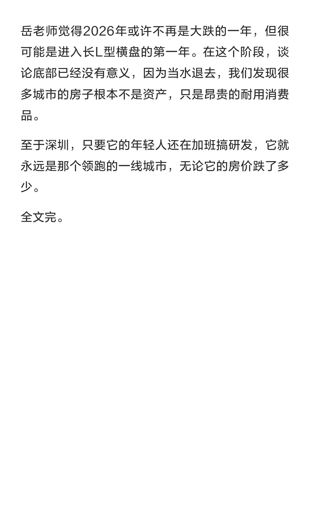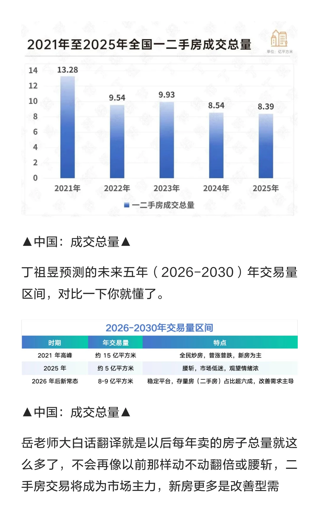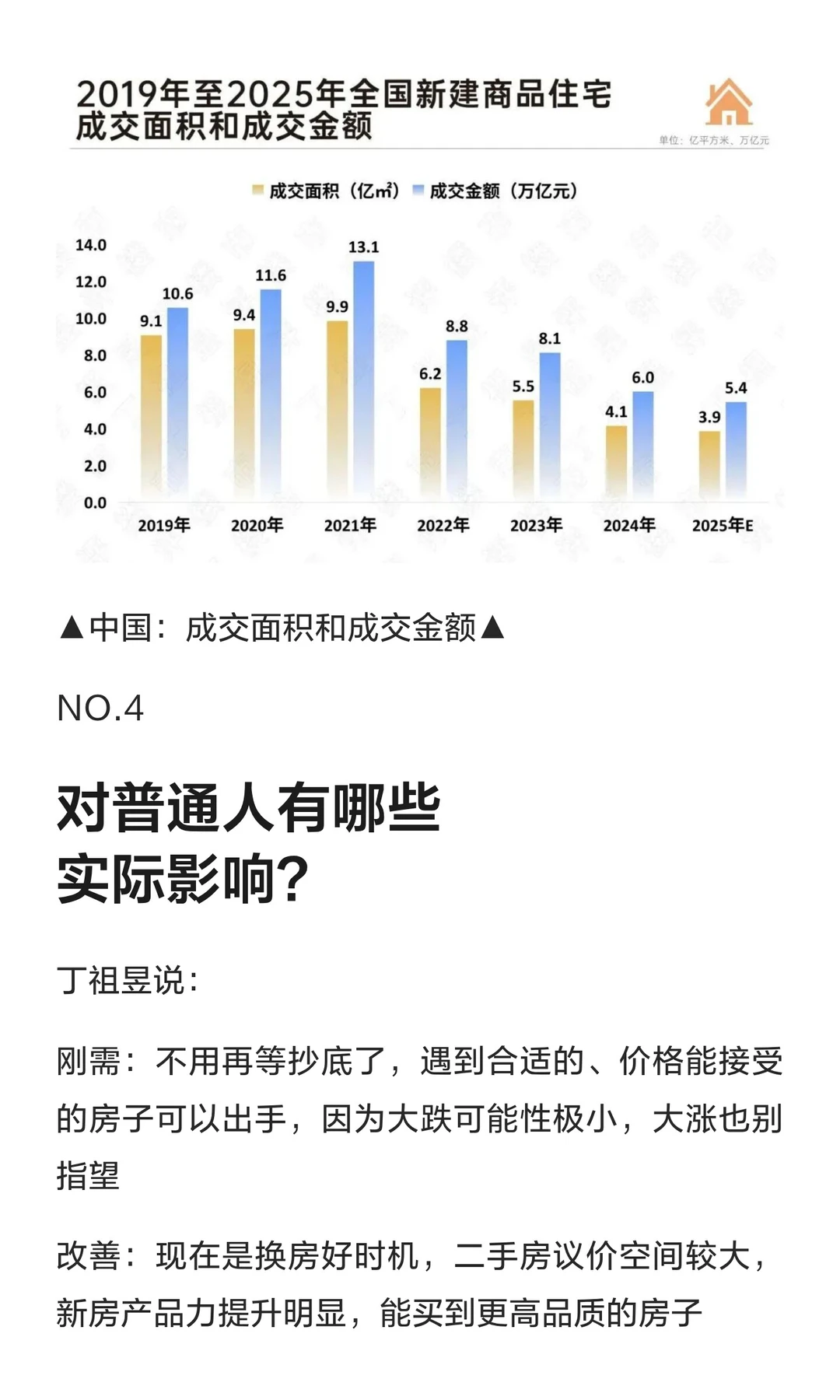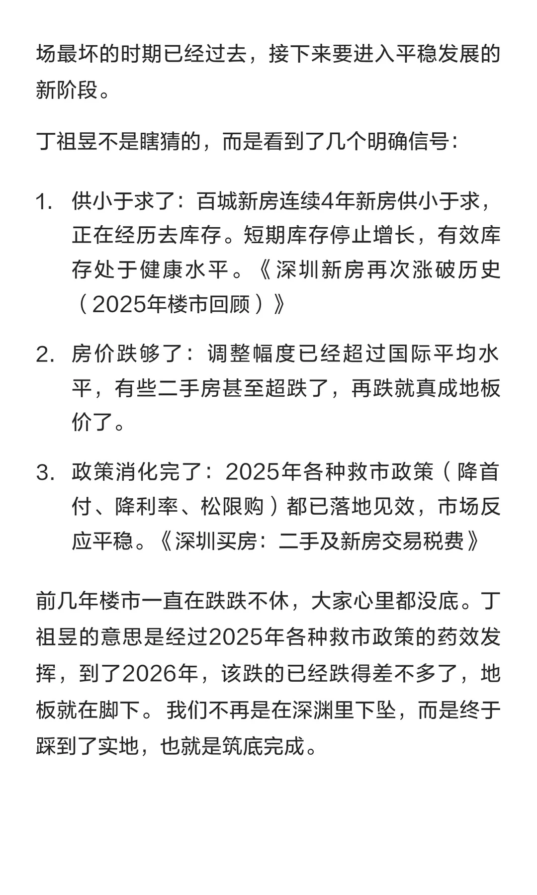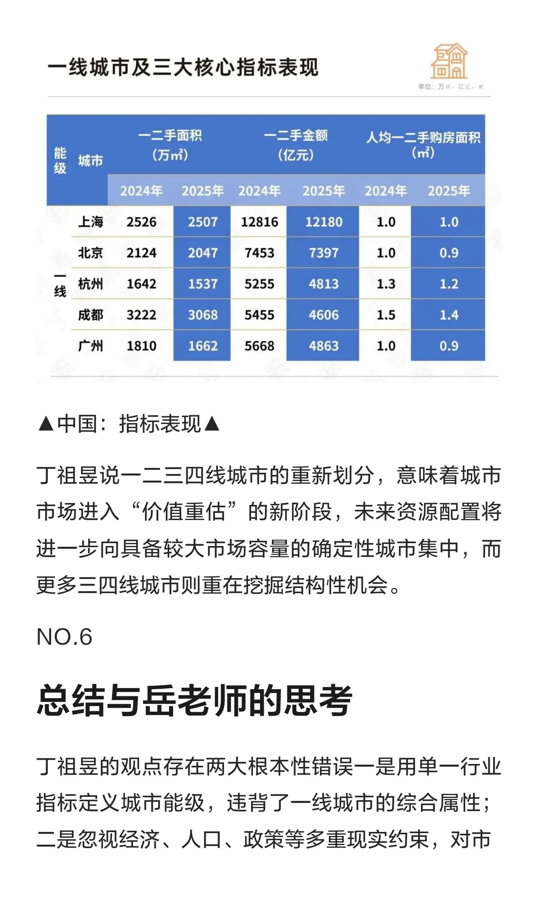 丁祖昱是易居企业集团的老板,他最近在2026年的年度发布会上说了个观点,叫“底部企稳”。简单说,就是中国房地产市场已经跌到谷底了,不会再往下掉,开始稳住了。 核心意思是这样的:他觉得2026年是楼市的“筑底完成年”,意思是说市场已经彻底触底,不再继续下滑。同时上海、北京、杭州、成都和广州5个城市被划分为一线城市,深圳掉出一线。