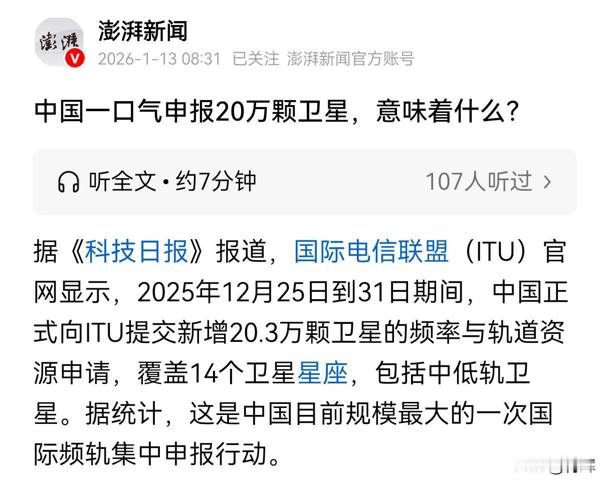 碾压了?中国申请20万颗卫星一个月后,美国直接申请100万颗 去年12月底的时候,我国正式向国际组织申报了二十万颗卫星低轨资源。这一事件也标志着我国发射低轨卫星进入实质性推进阶段。然而1月31号当天,马斯克的公司对外宣布,直接提交了100万颗卫星的申请。要知道马斯克的公司是和美国军工体系深度绑定的,该公司做出的一些战略举动,从某种层面上来说也是美国做出的一些安排。 在中国申请20万颗卫星一个月后,美国方面做出如此反应。很显然是针对我国所采取措施的一种反击。 那么美国的这100万颗申请数量是不是对我们20万颗的直接碾压呢?并不是这样的,其实无论是20万颗还是100万颗目前单纯的看申请数量没有什么太大的意义,因为500公里左右的这个低轨道上面最多可以容纳17.5万颗卫星,也就是说无论申请数目和通过数目是多少,最终主要看的是实际发射的数量。这一点中美两国都心知肚明。 而这个时候双方都大力提升申请卫星的数量,更多的还是想从气势上压对方一头。