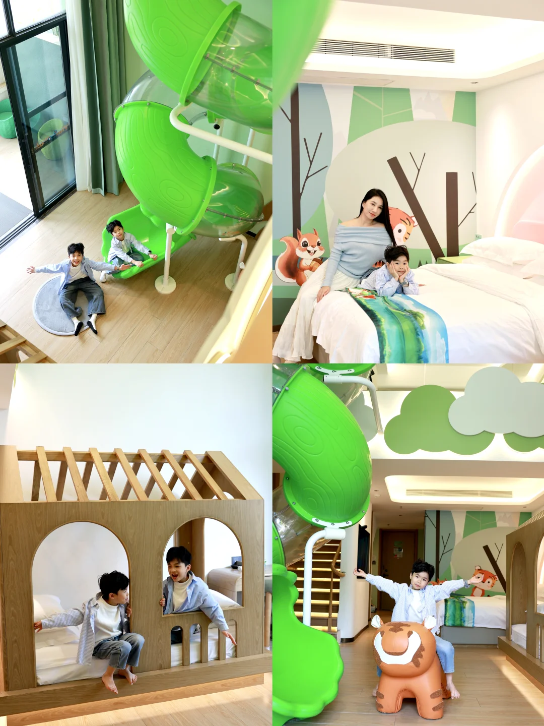 我们这次住的是🐿️松鼠酒店的「森林狂欢LOFT房」,一进门小朋友就“哇”了出来!整个房间是温柔的浅绿色,仿佛住进了森林童话里。楼上楼下都有床,空间很大,而且每间房都配了私汤泡池!晚上一家人泡着温泉看星星,氛围感直接拉满🌿