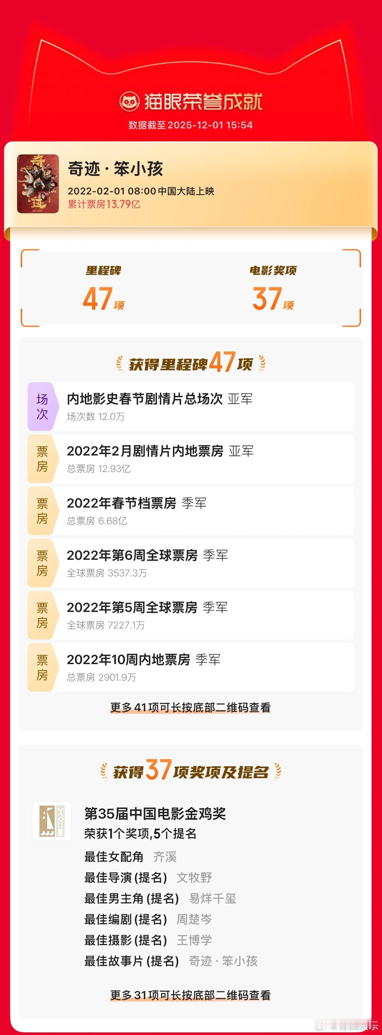 易烊千玺奇迹笨小孩上映4周年 “致敬新时代每一个拼搏奋斗的你,我们都是奇迹的创造者。”据猫眼专业版数据显示,领衔主演电影《奇迹·笨小孩》上映4周年,电影于2022年2月1日春节档上映,累计票房达13.79亿,获得里程碑时刻47项,获奖及提名37项。你看过这部电影吗?印象最深的是哪个片段?快来分享吧~奇迹笨小孩上映4周年
