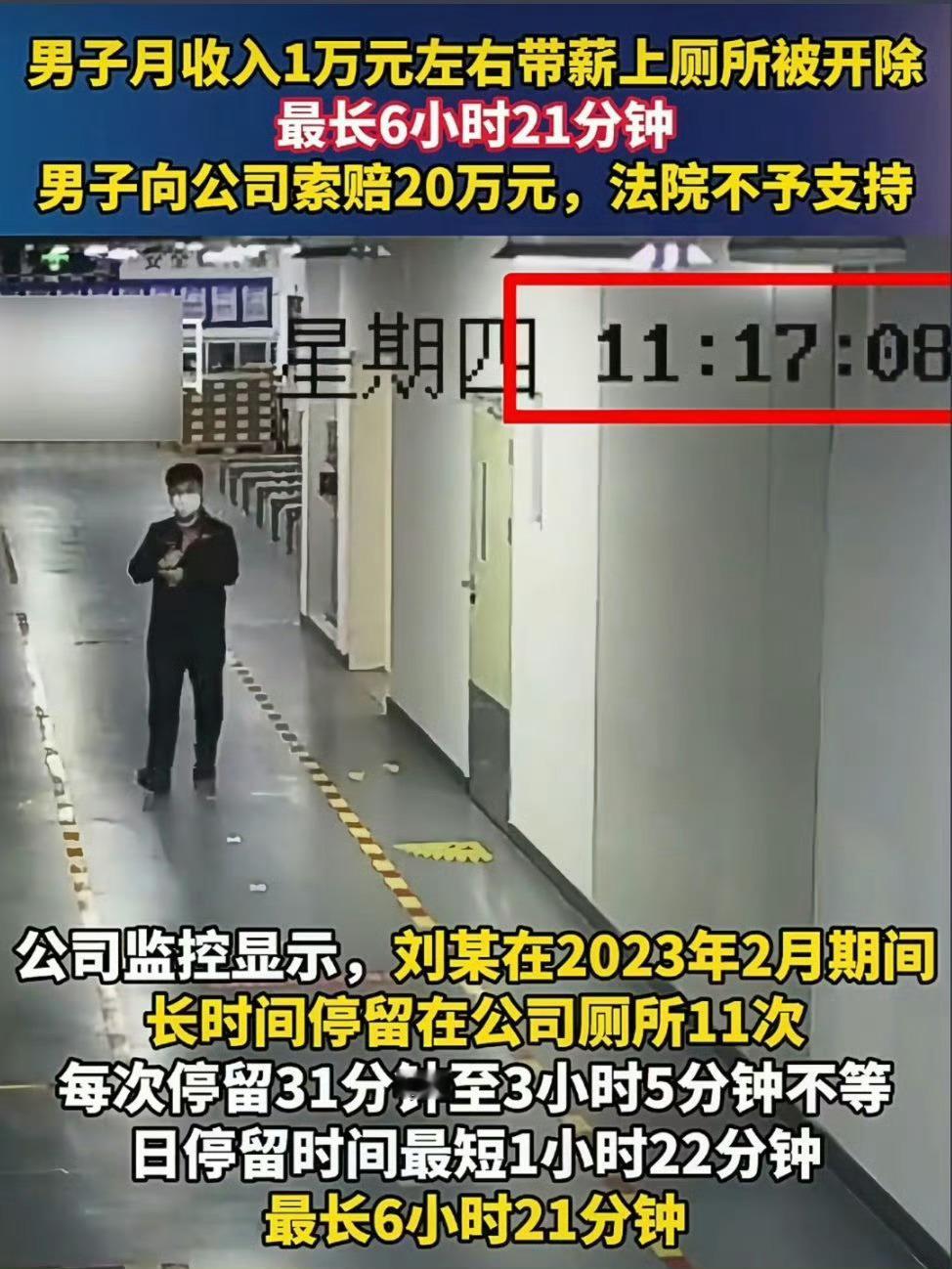 该员工长时间滞留卫生间被解雇后,居然向公司索赔20余万元,法院的判决很合理,这明显是“摸鱼”行为,如厕时间和次数明显超出正常生理需求。员工单日如厕6小时21分钟被解雇
