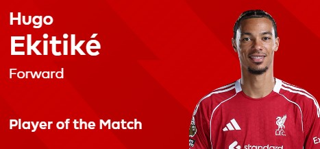 梅开二度,埃基蒂克当选利物浦4-1纽卡球迷票选全场最佳