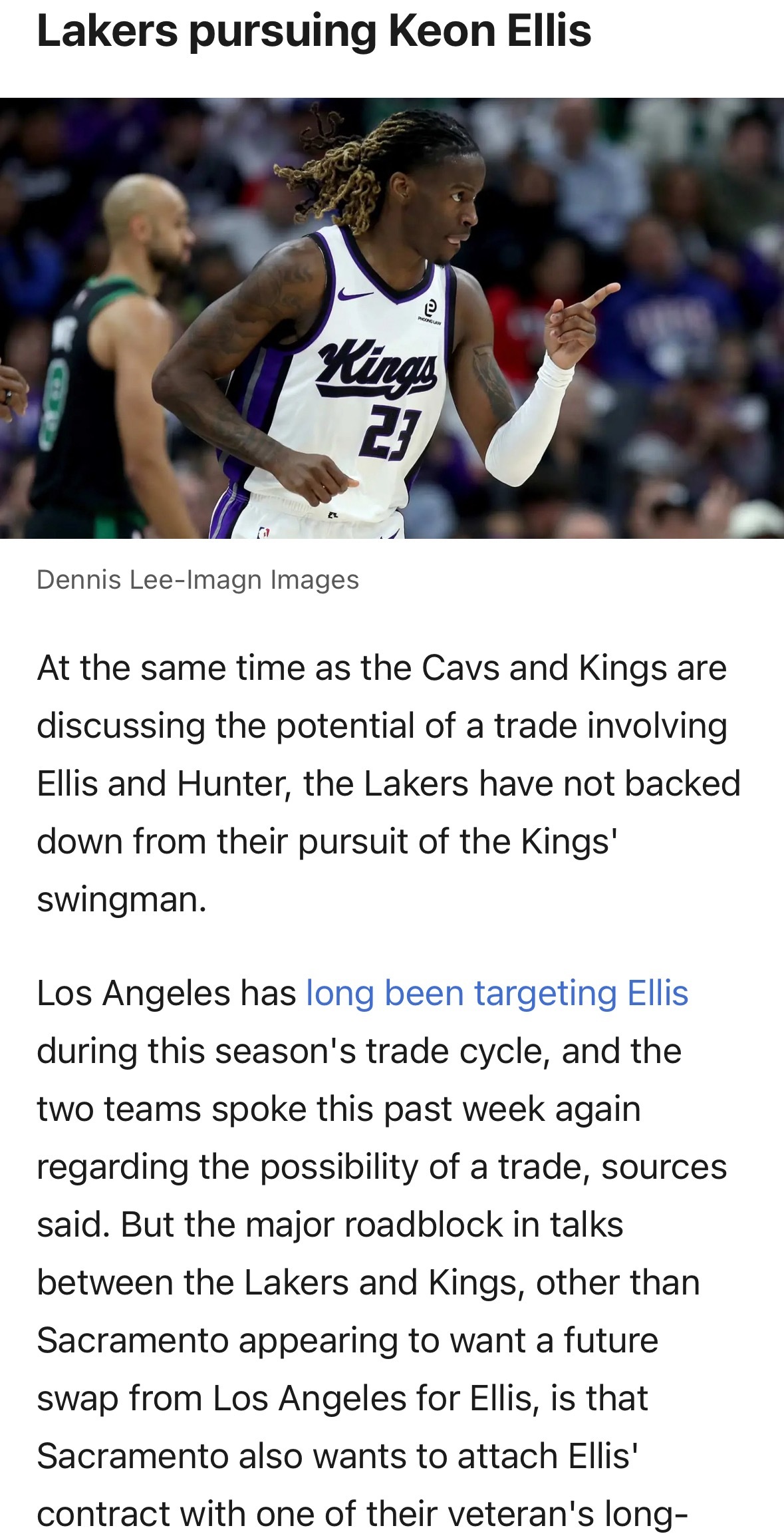 但湖人队与国王队谈判的主要障碍,除了萨克拉门托希望得到洛杉矶的未来选秀权互换之外,还在于国王队希望将埃利斯的合同与他们一位老将的长期合同捆绑交易。