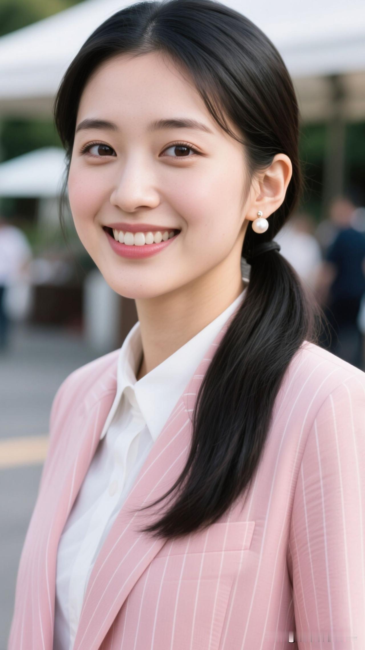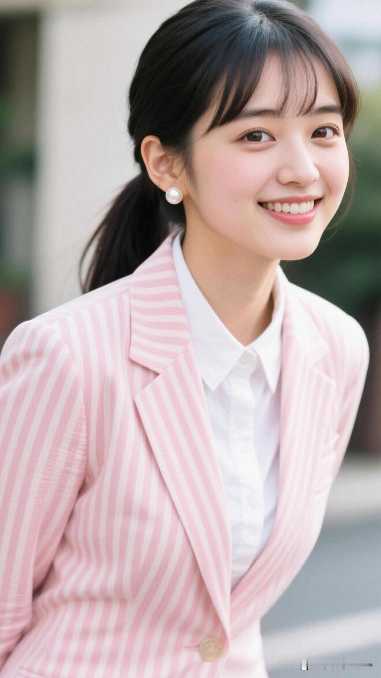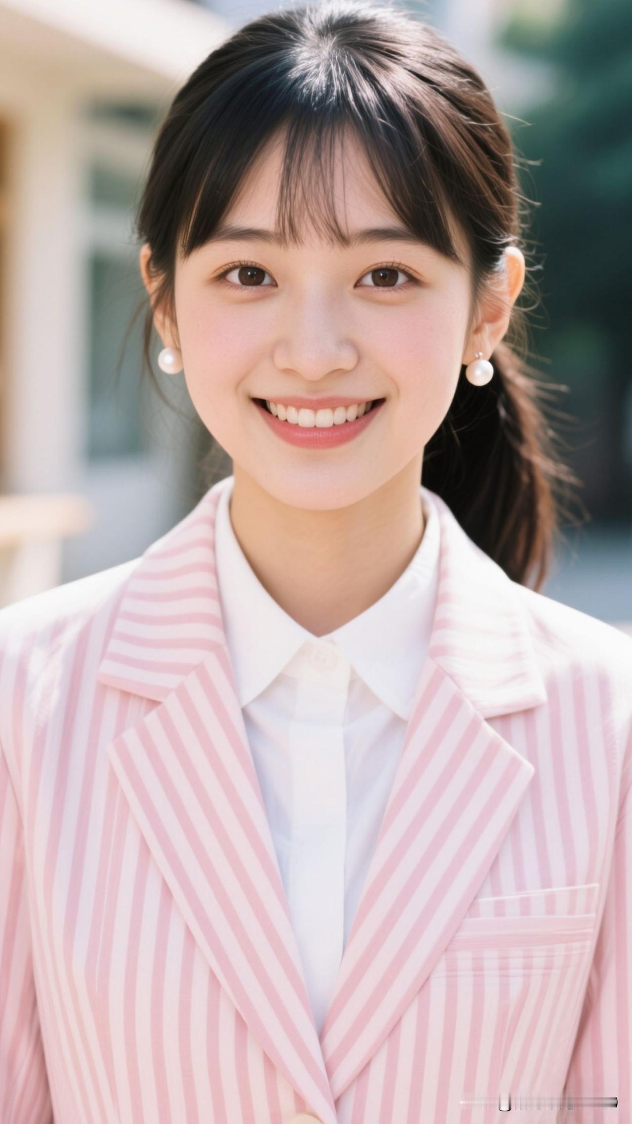 🌸 粉条纹西装裹住春日的甜,珍珠耳坠曳着柔光,笑起来时,连空气都漫着治愈的香。