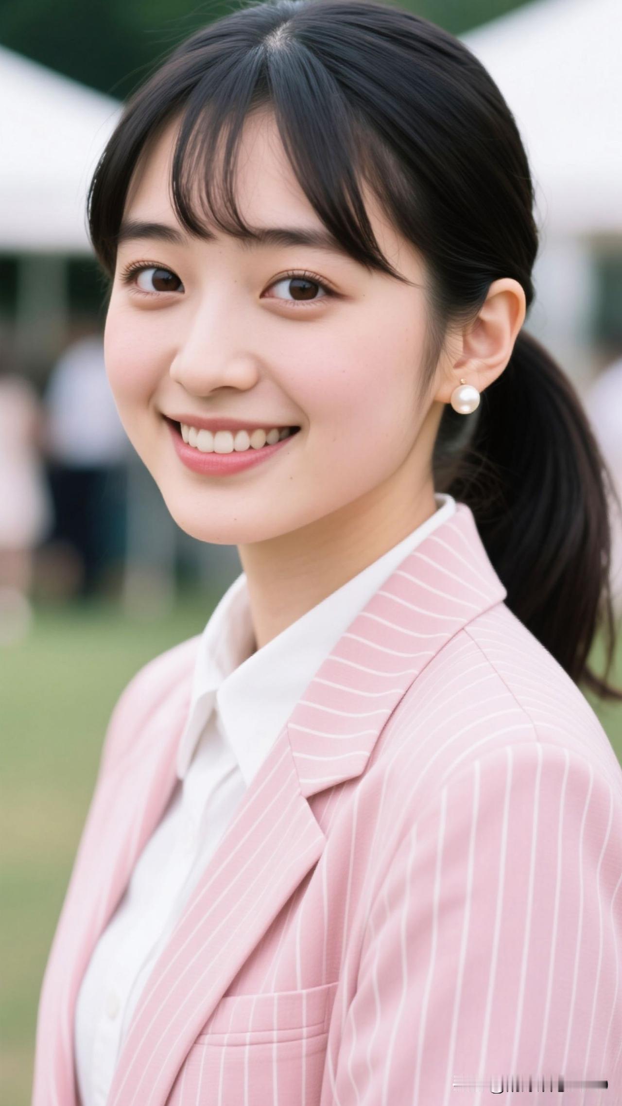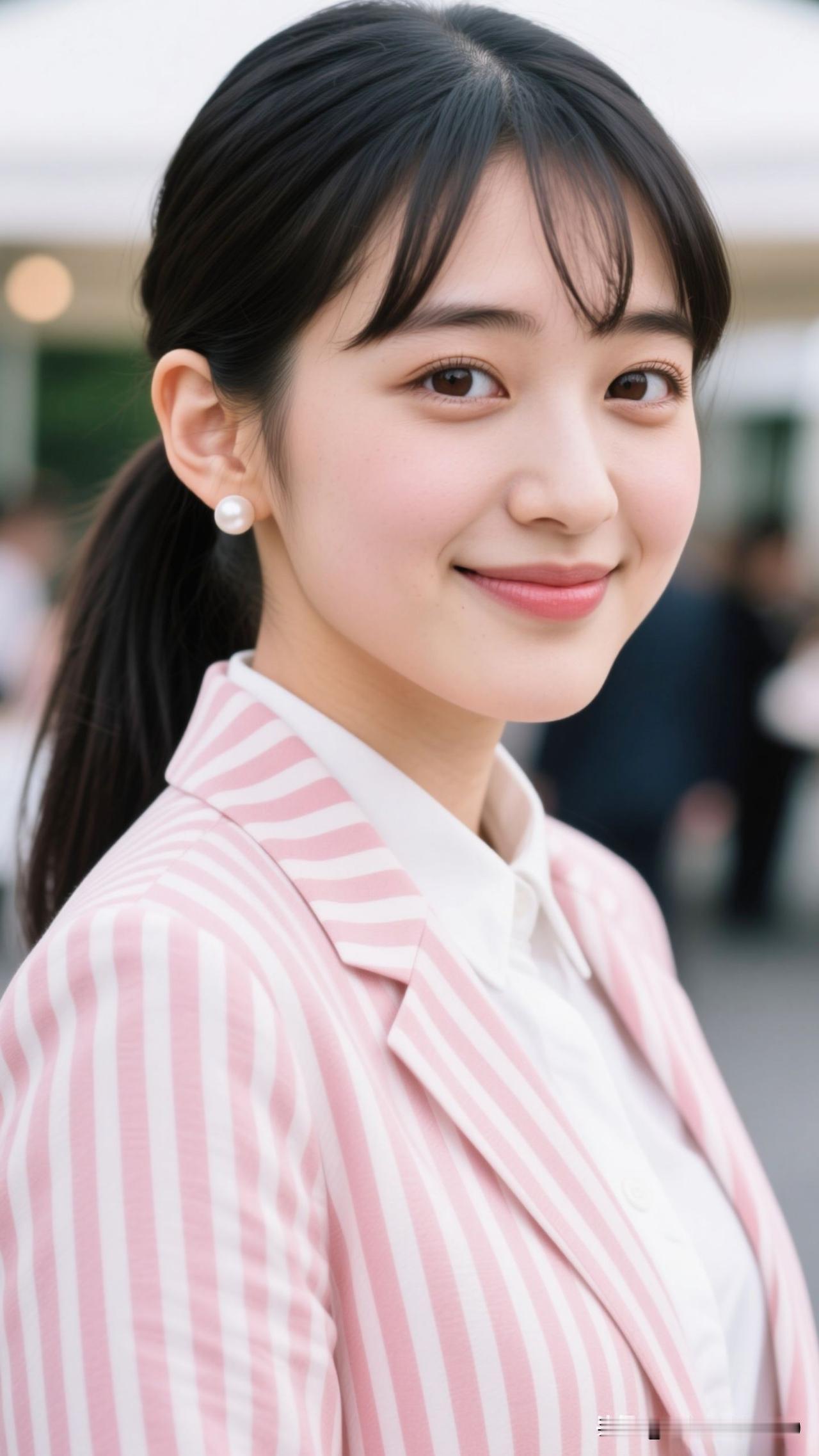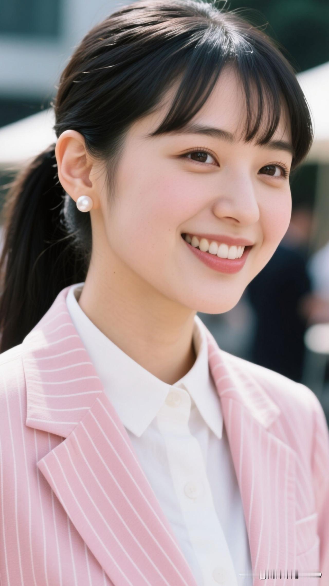 🌸 粉条纹西装裹住春日的甜,珍珠耳坠曳着柔光,笑起来时,连空气都漫着治愈的香。