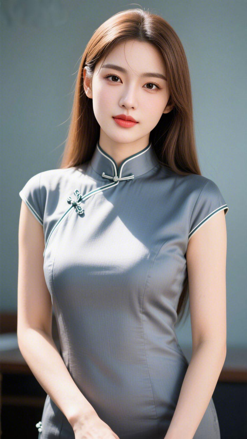 灰襟里的东方温雅 浅灰旗袍裹着一襟清宁,领口的青边,是雨巷墙垣上漫开的苔痕淡影。 发梢轻垂时,风都放轻了声息——无艳色张扬,只如案头素瓷中斜倚的枝柳,唇间的淡色,是晨雾里沾了露的梨花,温软得像春阳漫过窗棂。 她立在那里,如旧卷中展平的诗笺,未着只言,却藏着黛瓦巷陌的静穆。是木格窗漏下的软光,是青瓷杯沿的清润,是心底悄然栖落的、关于“平和”的模样。 无需多语,衣袂的纹路里,便载着江南的温软余韵。 旗袍里的东方意 浅灰清宁