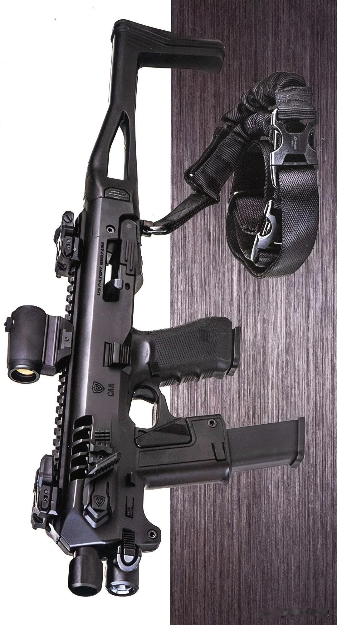 美国CAA武器公司RONI卡宾枪小型转换套件 CAA武器公司出了款新的RONI卡宾适配套件,是之前RONI系列的简化便携款,适合第三代或第四代的格洛克17、19手枪用。 这个套件不用改手枪,把枪放进套件里对应的地方锁好就能用,比老款设计得更简单。 它有可以折叠的枪托,样子像个便携的冲锋装备,拉开长567毫米,折起来348毫米,带着走很省事。套件顶部有个通用安装导轨,能装折叠的机械瞄准器和红点瞄准镜。拉机柄在握把的后上方,通过里面的零件跟手枪套筒连在一起,往后拉就能带动套筒,左右两边都能操作。 扳机护圈前面加了个能放备用弹匣的槽,还能当竖握把用。枪口下面装了战术灯,控制按钮在竖握把的前上方,左右都有,用起来很方便。