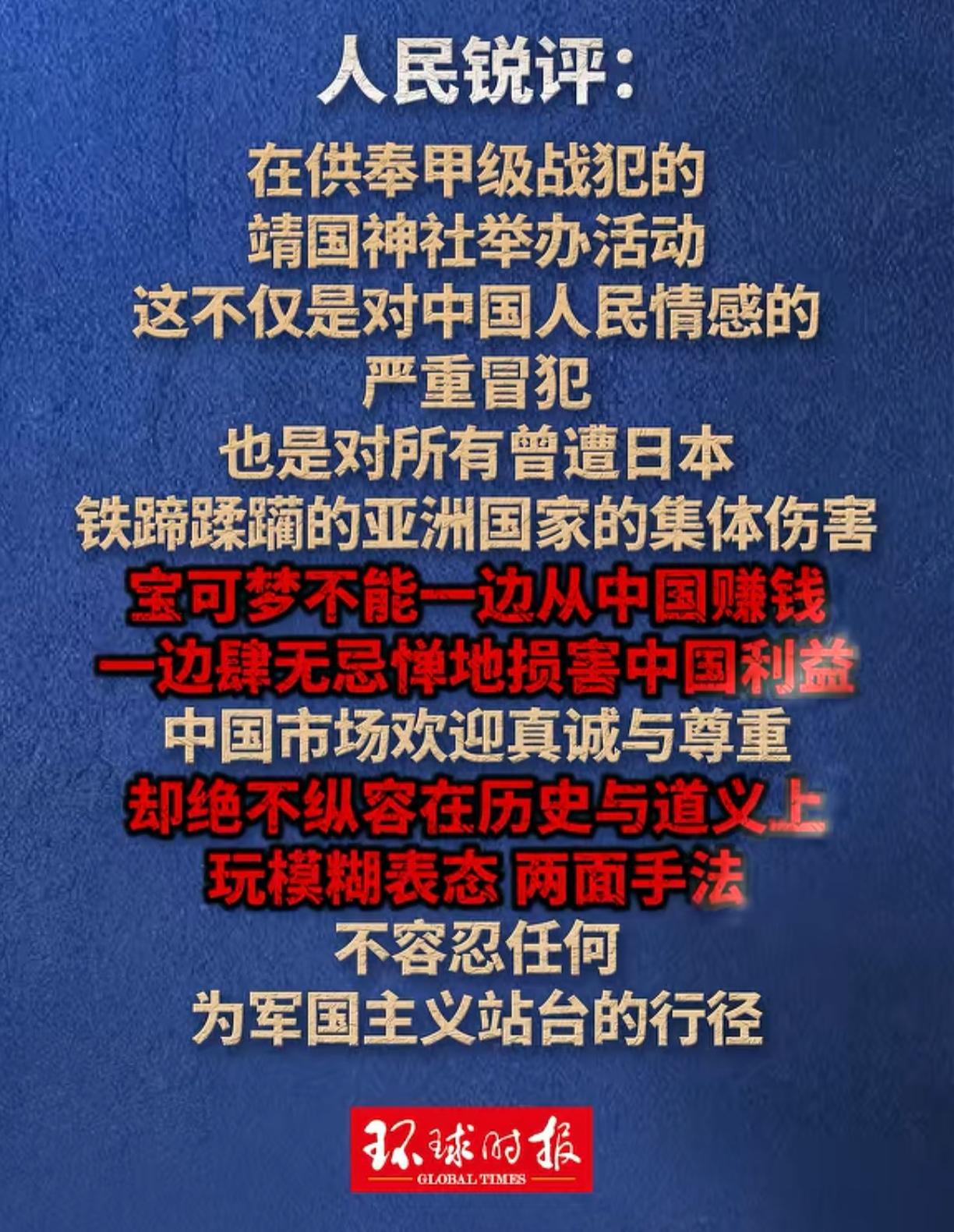 日本宝可梦在中国狂赚钱,却想在靖国神社搞活动,为军国主义招魂,中国需要这样伤害中国人民感情的文化公司吗?更何况在当下中日关系的背景下! 先了解这是一个什么公司,能给中国少儿带来什么?一个为军国主义招魂的公司又能给中国少儿喂什么? 宝可梦在中国由宝可梦(上海)玩具有限公司统筹,核心做游戏、卡牌、IP授权、影视发行、品牌运营五大块,与网易、腾讯等合作。 一、核心业务概览 游戏业务 手游:网易代理《宝可梦大探险》,负责运营与更新。 主机:腾讯发行Switch版《宝可梦 Let's Go 皮卡丘/伊布》(2024年9月发售)。 卡牌业务 2022年推简体中文版宝可梦集换式卡牌(PTCG),建官方道馆与赛事(如大师赛),带动零售与赛事生态[__LINK_ICON]。 IP授权与周边 覆盖玩具、服装、文具、食品等,与多品牌联名,拓展线下零售与主题活动[__LINK_ICON]。 影视发行 动画在B站、爱奇艺、腾讯视频等平台上线;剧场版(如《大侦探皮卡丘》)院线公映[__LINK_ICON]。 品牌与市场 统一品牌管理、公关推广、本地化营销,维护IP形象与用户触达[__LINK_ICON]。 二、运营主体与合作 主体:宝可梦(上海)玩具有限公司(2020年成立,日本宝可梦公司全资),统筹所有业务。 核心伙伴:网易(手游)、腾讯(主机发行)、各大视频平台(影视)、卡牌经销商与赛事合作方。 一句话总结:以IP为核心,通过游戏、卡牌、影视、授权与线下活动,构建全链路娱乐消费生态,覆盖线上线下与不同年龄层。 看看,他的业务就没一个有含量的,对中国少儿有益的,全是给中国少儿传日本文化的,为了让孩子玩,敬仰日本文化。 不接受他的道歉,道歉值几个钱,不欢迎吃饱反咬的这种! 你支持吗?宝可梦