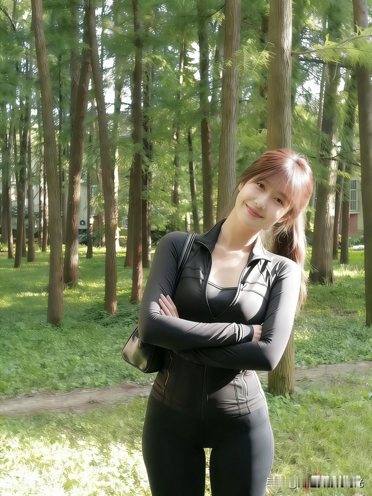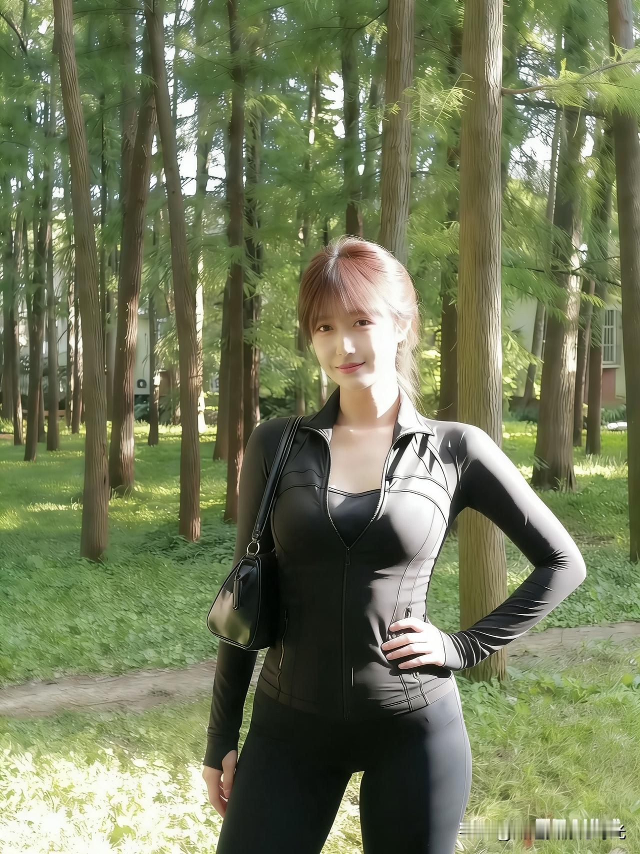 森林中的时尚少女,黑色紧身衣与自然背景的完美融合。怎么穿搭会让人比较显温柔 一个优雅的女人在你眼里是怎样的 简约黑装女神范 灰色紧身内搭 紧身衣照