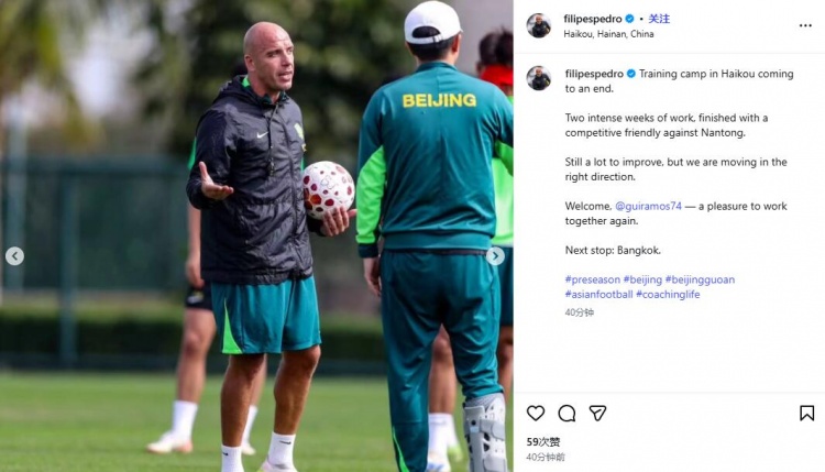 直播吧2月1日讯国安助教菲利佩·佩德罗更新社交媒体,称球队正走在对的路上。