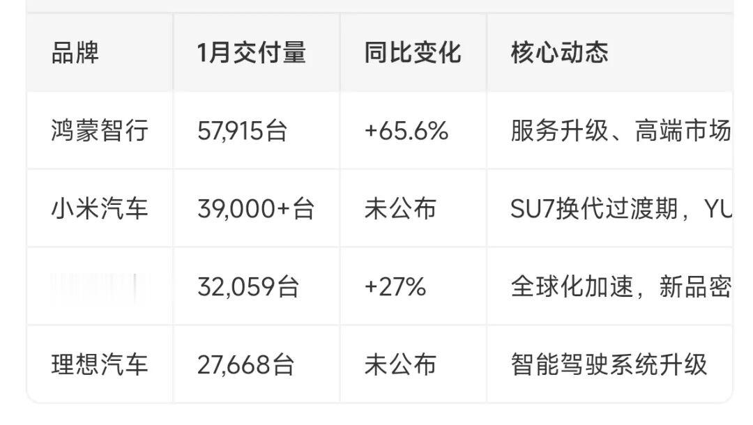 小米、鸿蒙、理想等多家车企公布1月交付量,鸿蒙智行排名第一