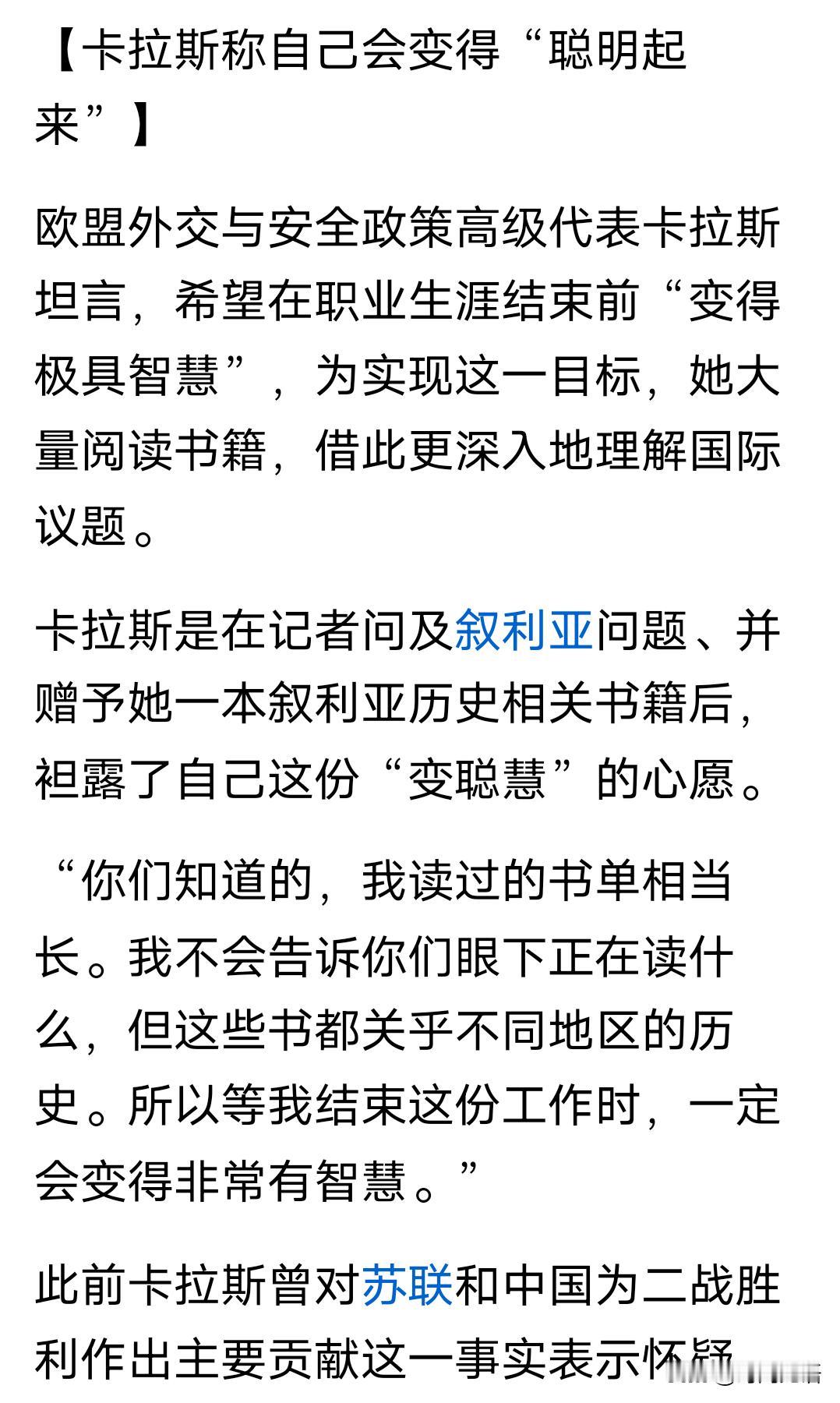 从卡拉斯的眼神里知道她读过的书单很长,她会变得越来越聪明,哪怕读的只是书单而别人读的是书。 能说出这样的话说明卡拉斯还是有自知之明的,书读的少不是她的错,她错在不懂的事不该乱说。 卡拉斯幸好是在欧盟任职,换个地方是不会允许她在职业生涯结束前“变得极具智慧”的……