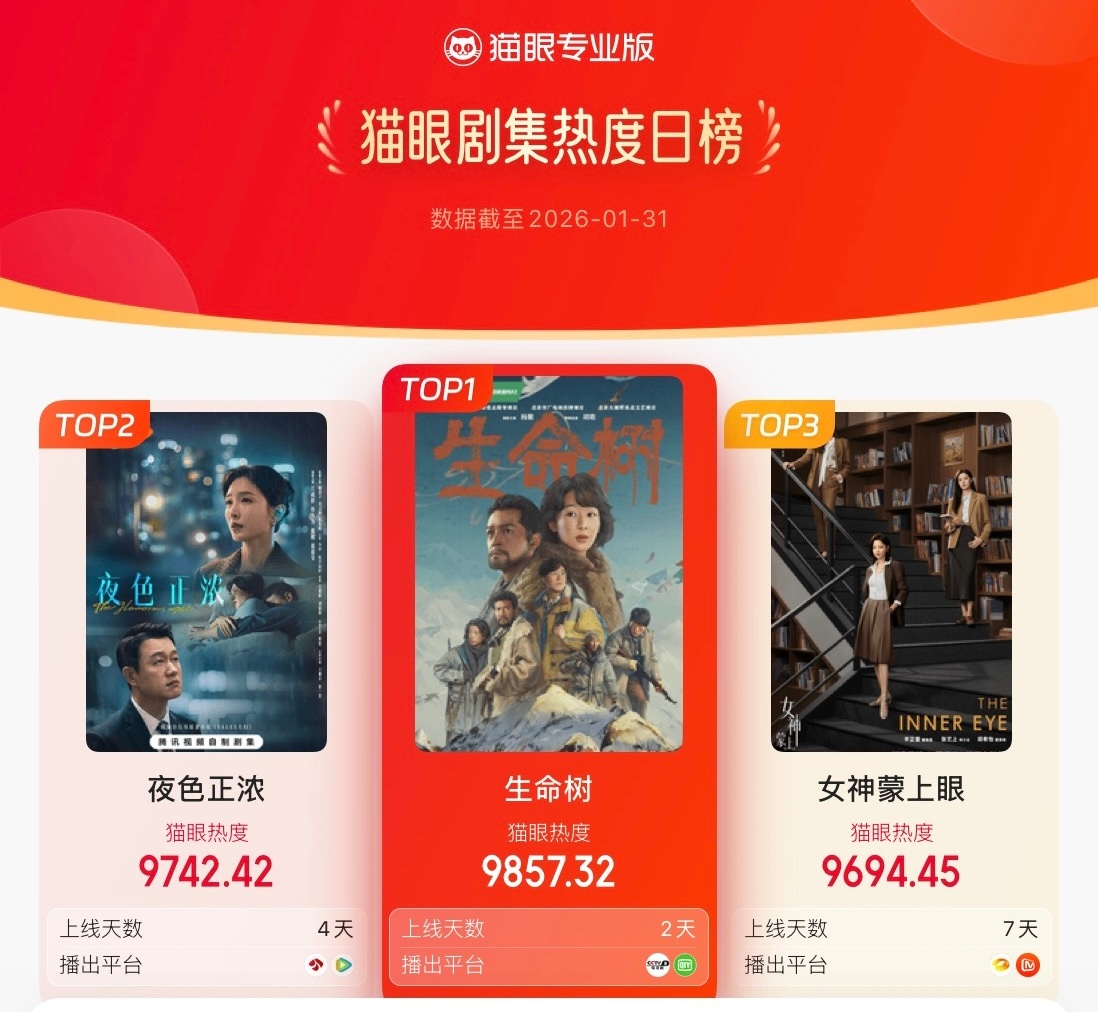 生命树昨天抖指478万,猫眼热度9857登顶,V榜剧集登顶,杨紫白菊V榜角色指数