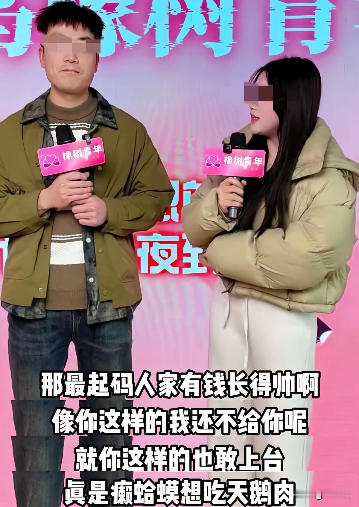 这是发生在某相亲节目上的一幕,看似长得挺水灵的女生怎么说出了如此不水灵的话。被相亲男生怼得哑口无言,虽然这名相亲男生说得很直白,很难听,但是却都是事实,相亲女生跟相亲男生说:自己已经降低很多要求了来相亲,我前男友年收入 500 万,身高 1 米 8,而且还会哄我,为我花钱。男生直接怼到,那他为什么没有娶你呢?他只不过想睡你而已。女生听到这样的话,很生气直接怒怼道,最起码人家有钱还又帅呢,你这样的我还不给你呢,你这样的居然敢上台,真是癞蛤蟆想吃天鹅肉。男生听完绝不惯着她,直接来了杀招:我是来相亲的,不是来睡觉的,收入还比你前男友高,你是不是该下去了? 直接把该女生怼得哑口无言。现在部分女生根本就没有认清形事,没有认清自己的条件,对男生有过高的期待。或者把相亲的男生跟自己的前男友进行对比,总觉得这里比不上,那里比不上自己的前男友,甚至出口伤人,而现在的 00 后男生也绝对不会惯着你,怼你不客气,你既然不客气,那也不要怪我不客气。一定会怒怼回去。这个相亲节目上的一幕就是如此大家都是来相亲的,是为了结婚而来,我为什么要惯着你,大家都是平等的。大家都是父母生养的,没有必要来这里受你的气。