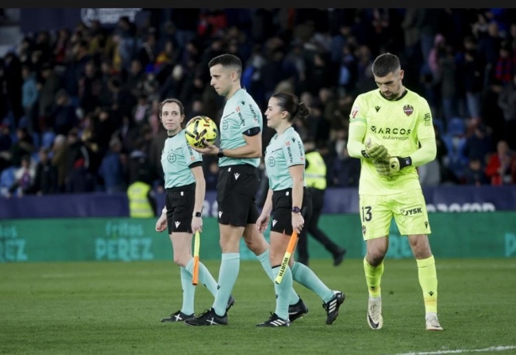 直播吧2月1日讯西甲第22轮比赛,莱万特在主场和马竞互交白卷。本场比赛,两名女性裁判出现在裁判团队中,两人均是担任助理裁判。