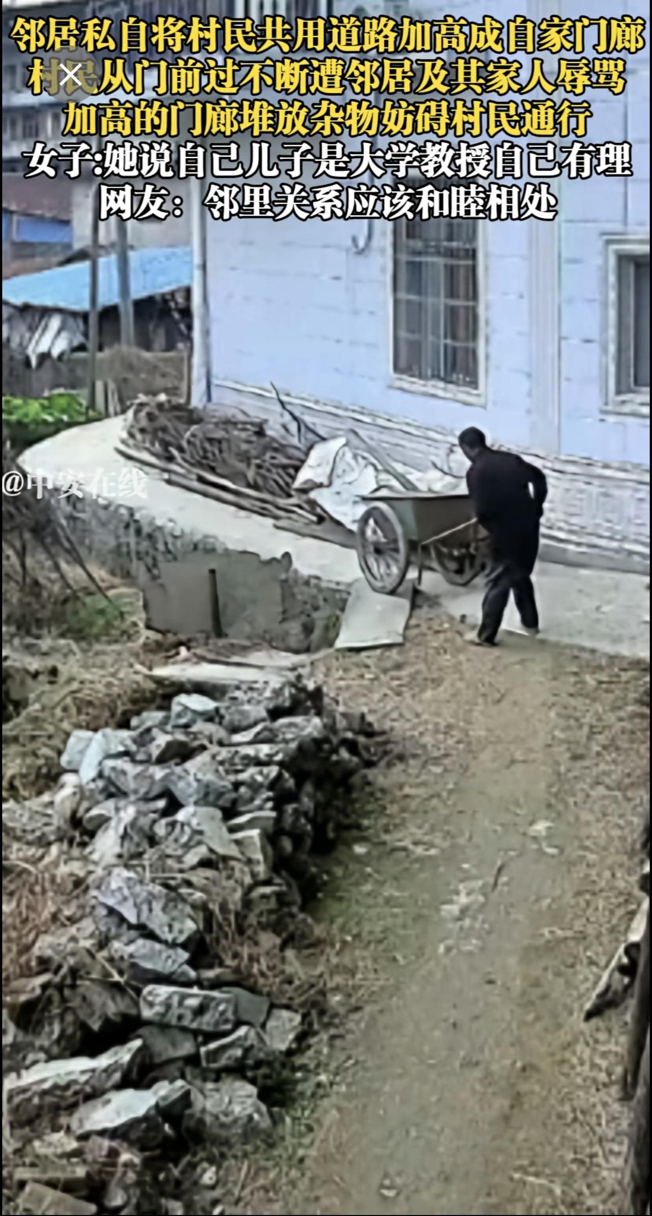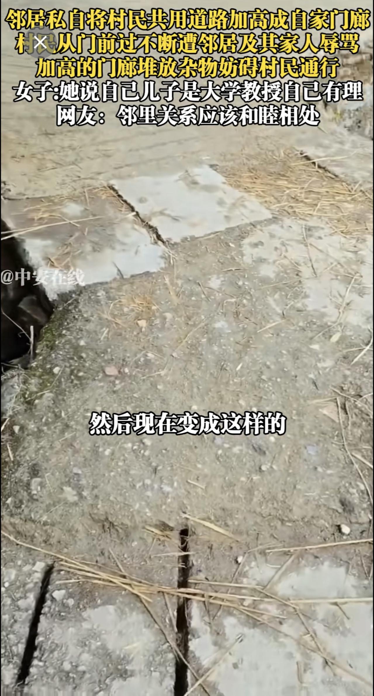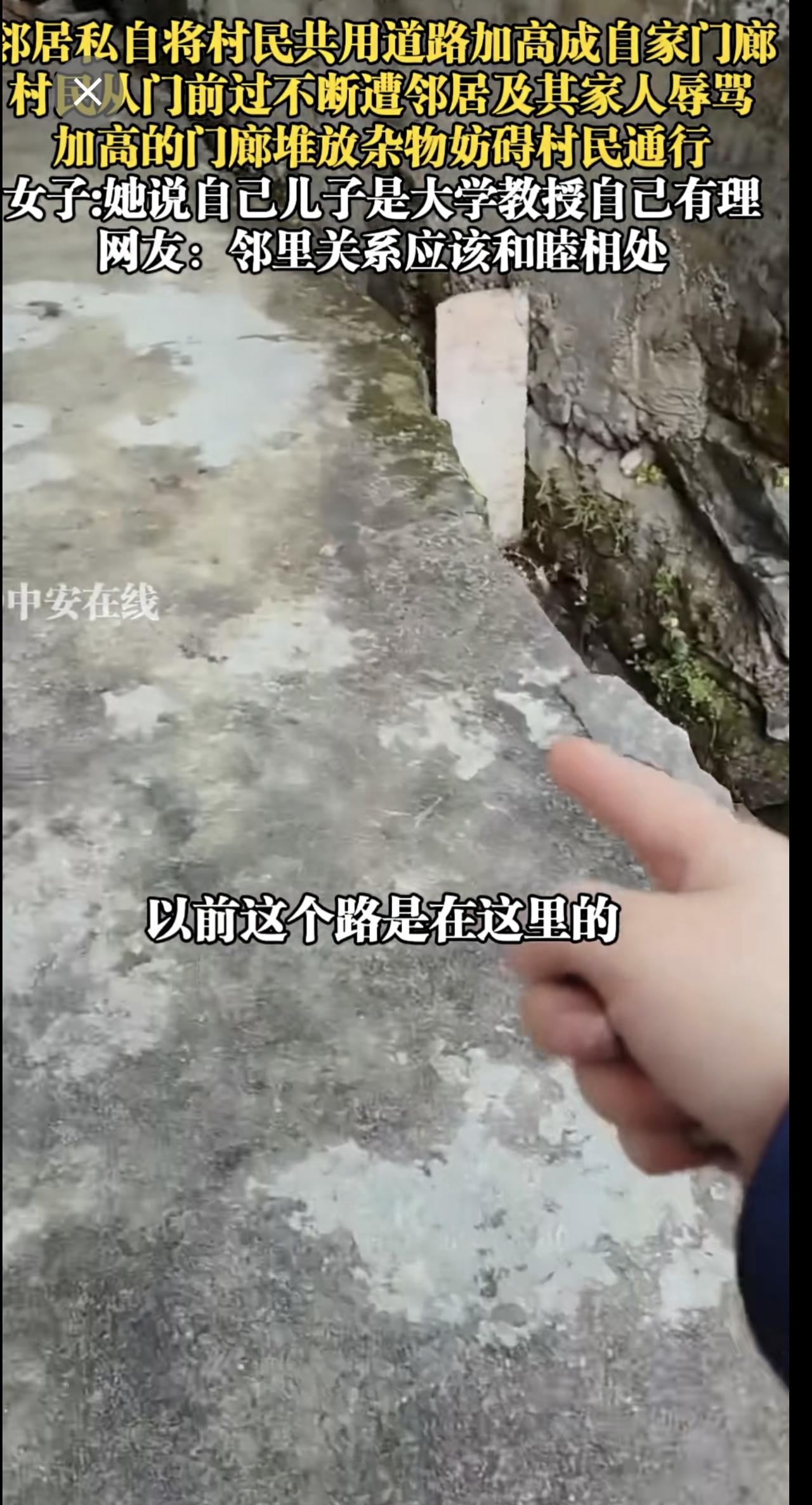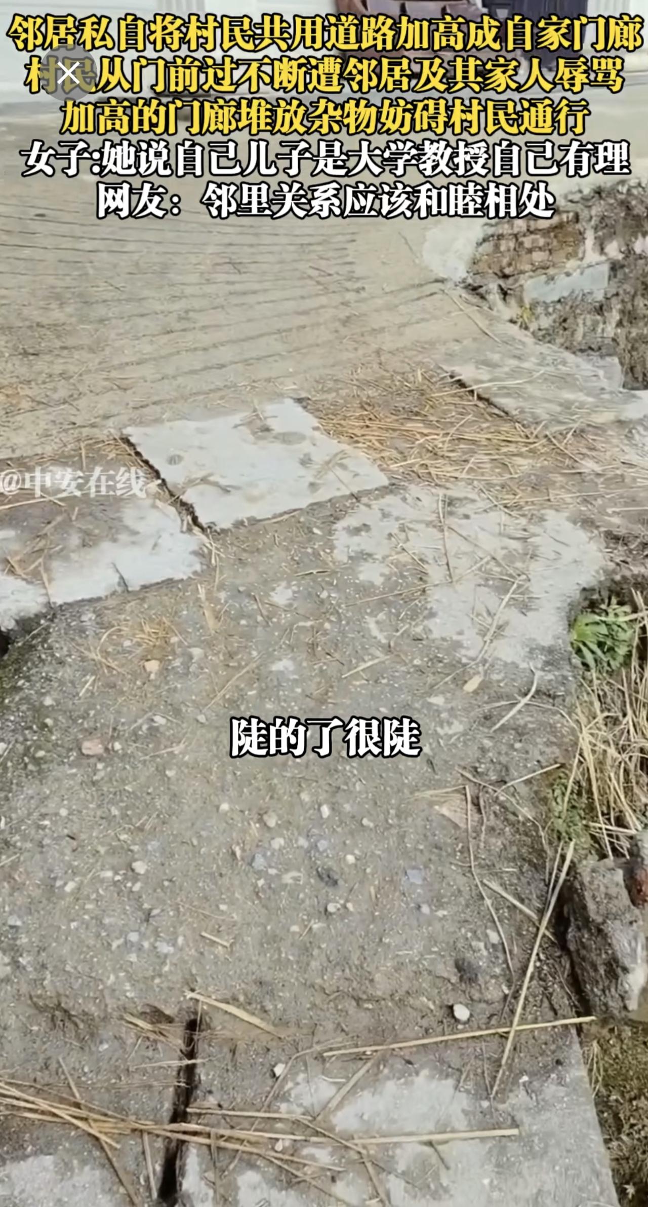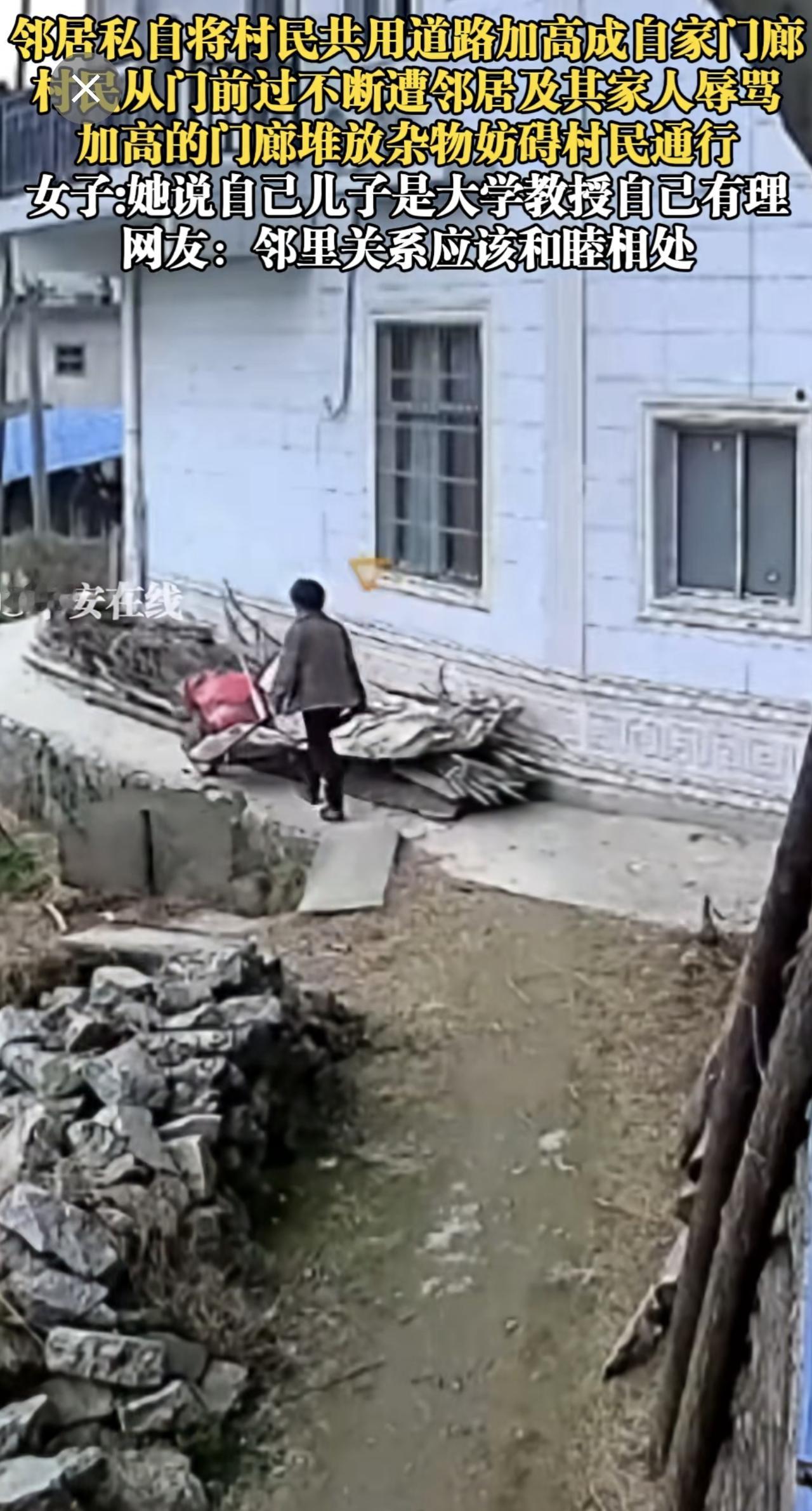 2月1日(报道时间),湖南。邻居私自将村民共用道路加高成自家门廊,村民从门前过不断遭邻居及其家人辱骂,加高的门廊堆放杂物妨碍村民通行,女子:她说自己儿子是大学教授自己有理,网友:邻里关系应该和睦相处(陈三多)投稿邮箱:3882124142@qq.com;更多视频点击关注@中安在线