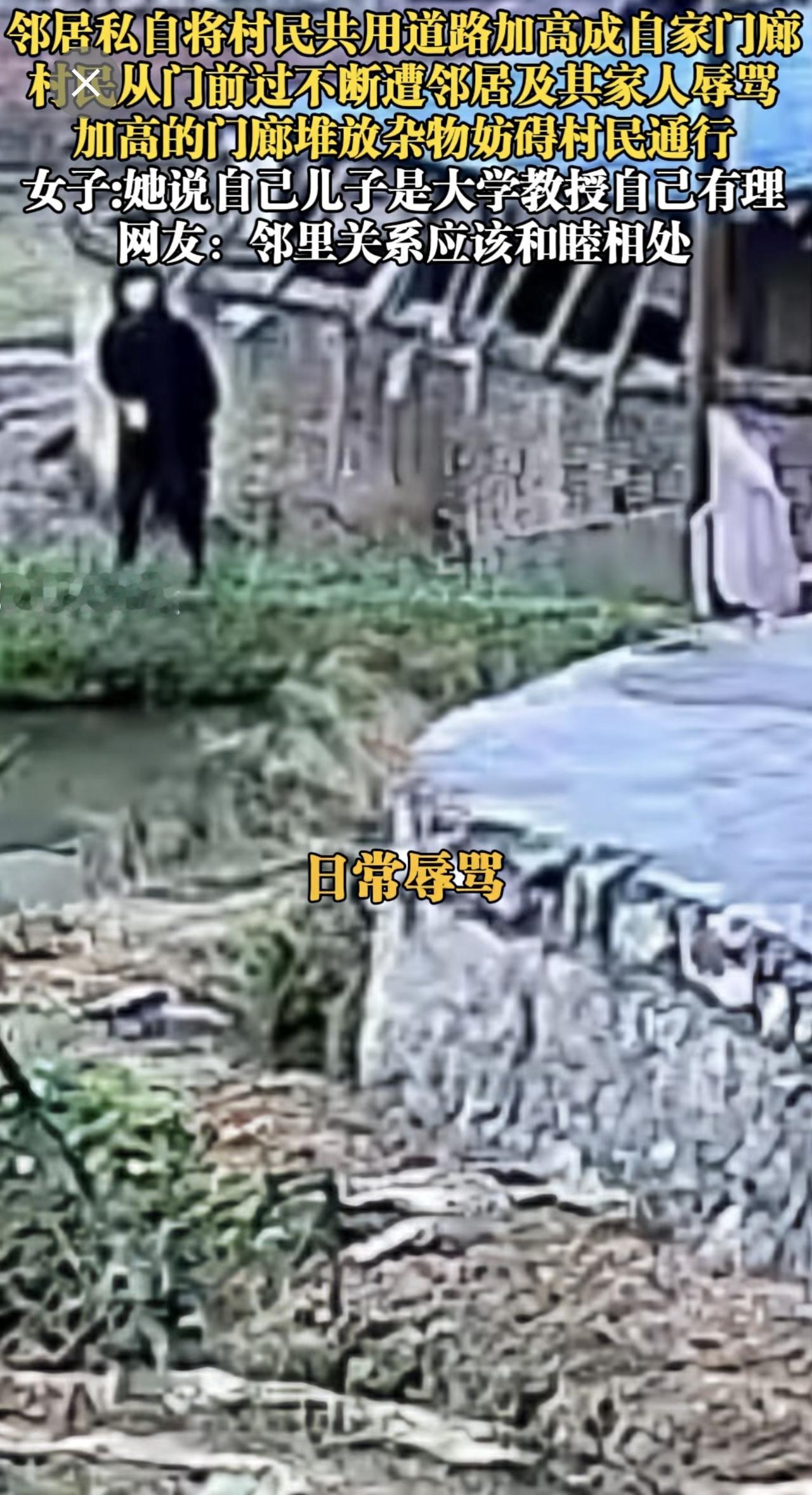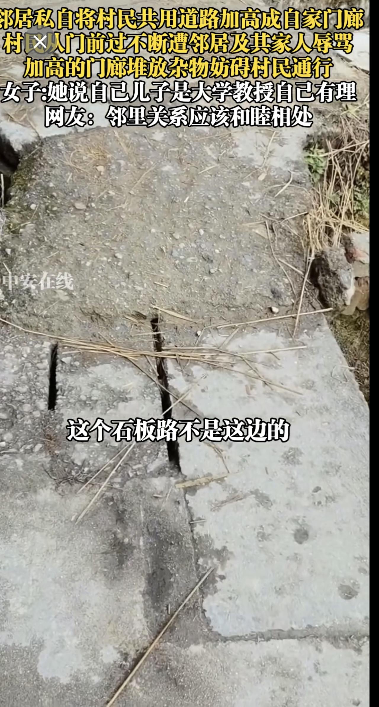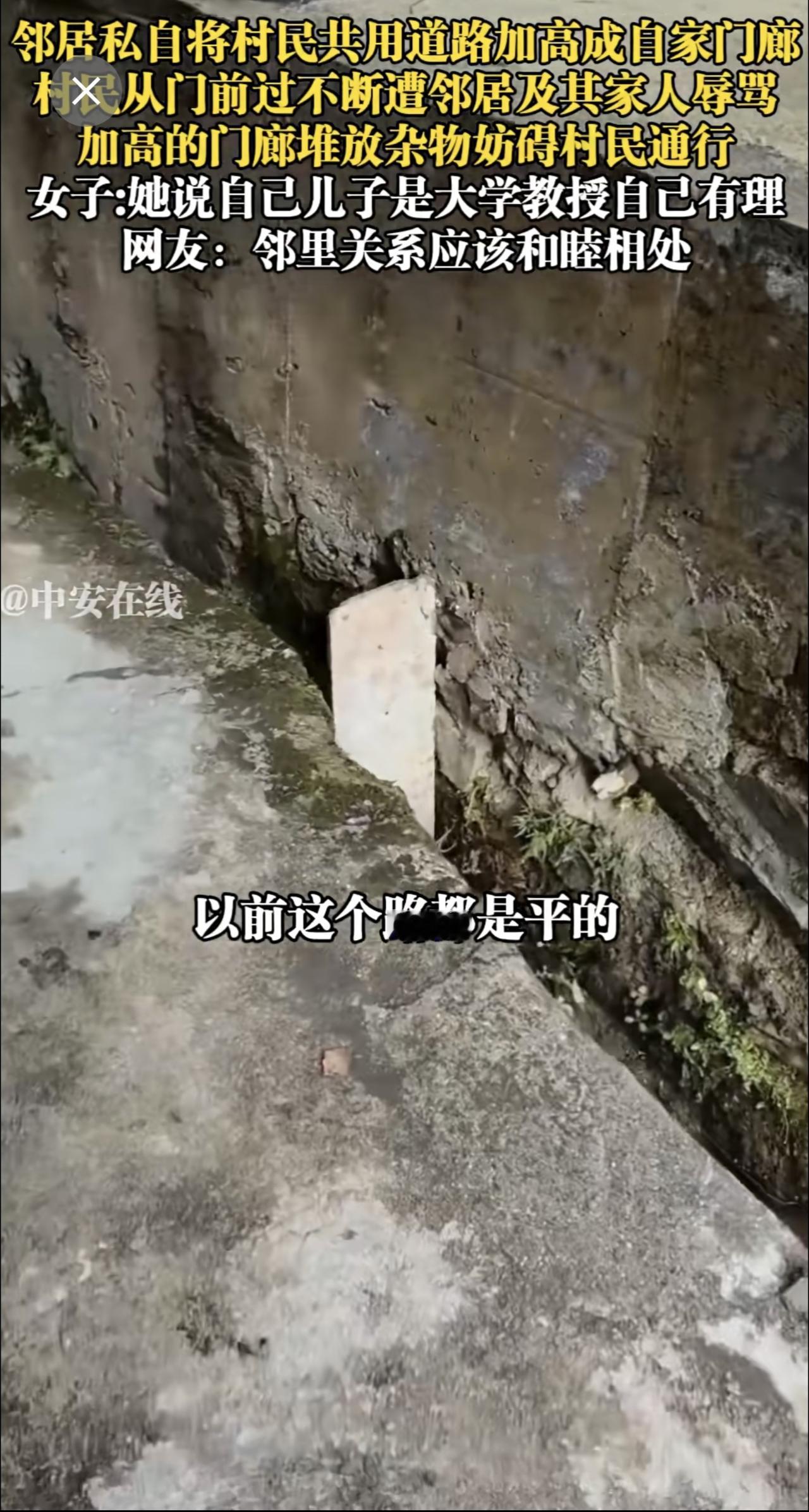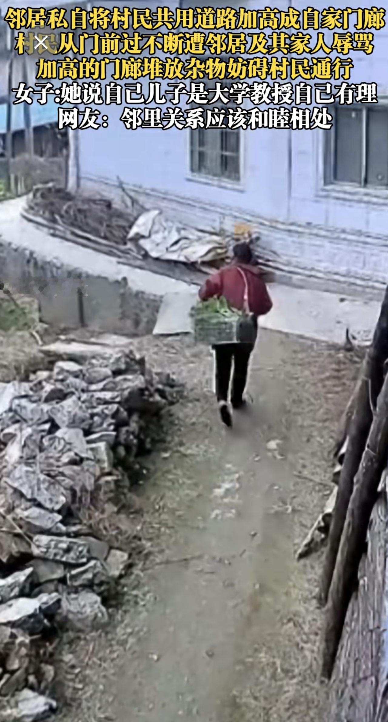 2月1日(报道时间),湖南。邻居私自将村民共用道路加高成自家门廊,村民从门前过不断遭邻居及其家人辱骂,加高的门廊堆放杂物妨碍村民通行,女子:她说自己儿子是大学教授自己有理,网友:邻里关系应该和睦相处(陈三多)投稿邮箱:3882124142@qq.com;更多视频点击关注@中安在线