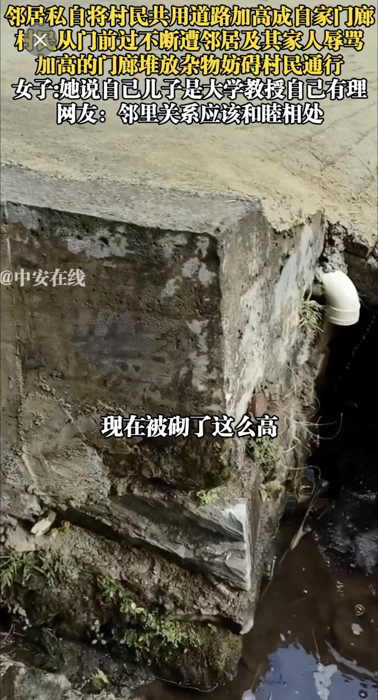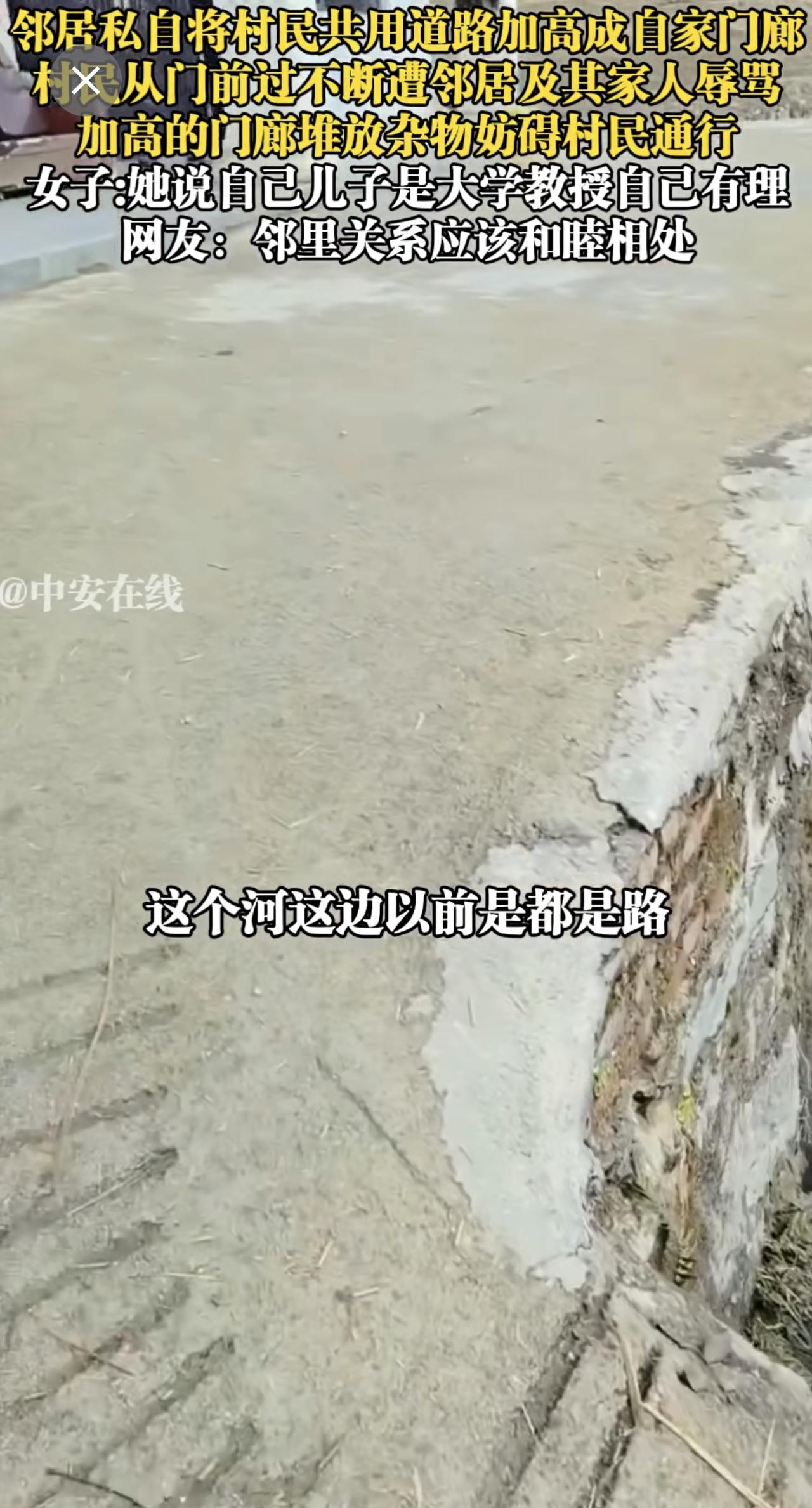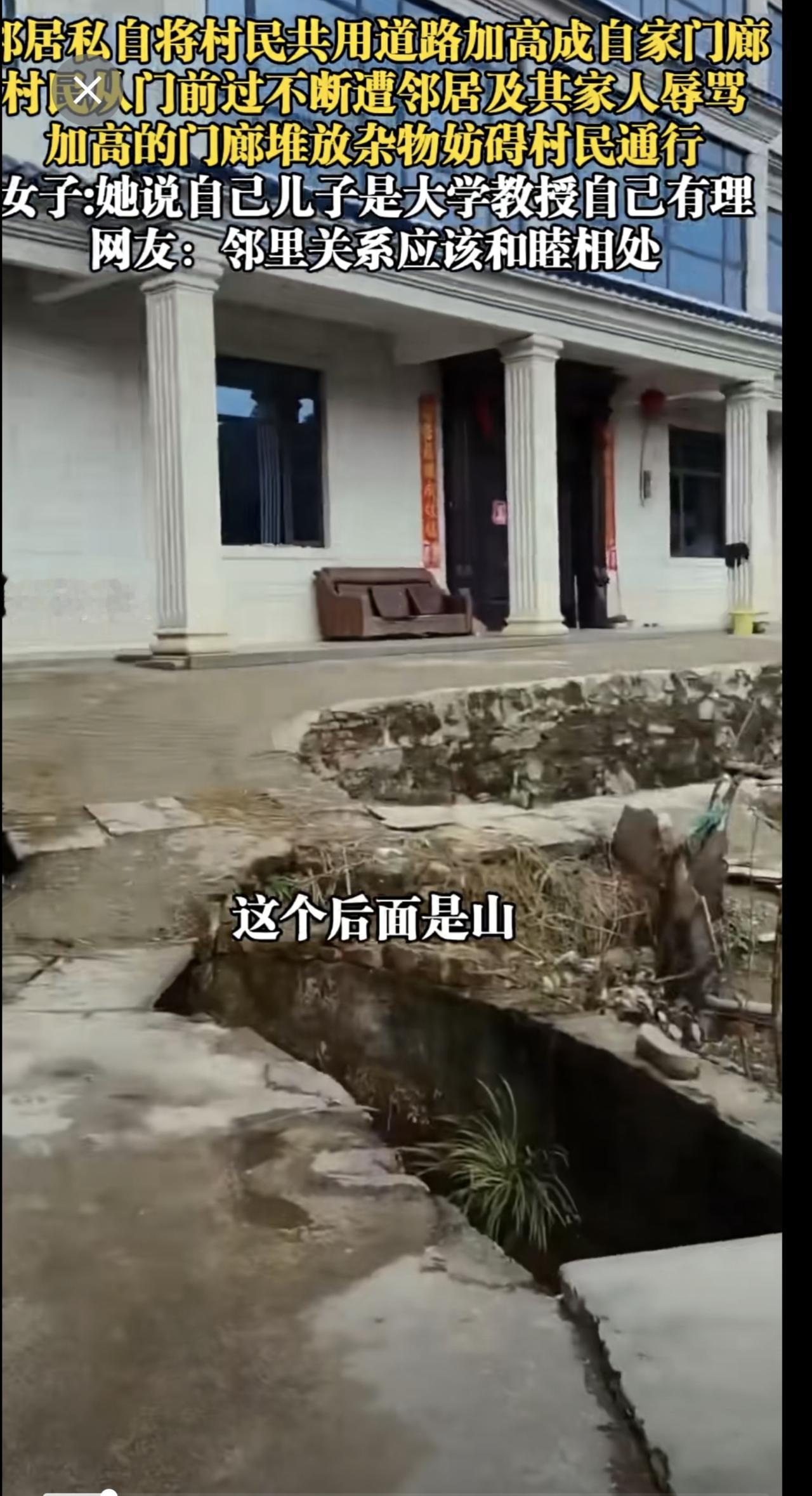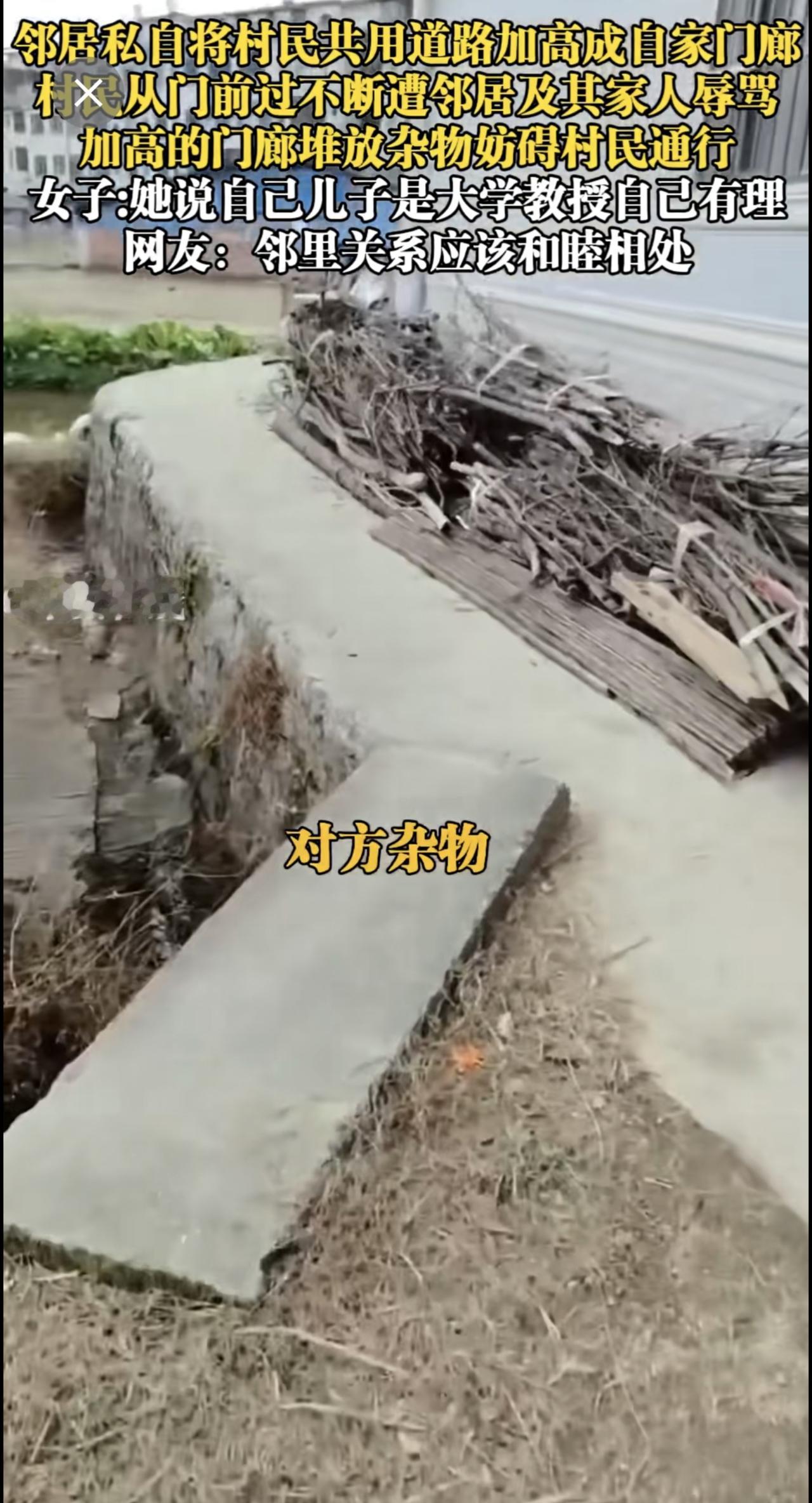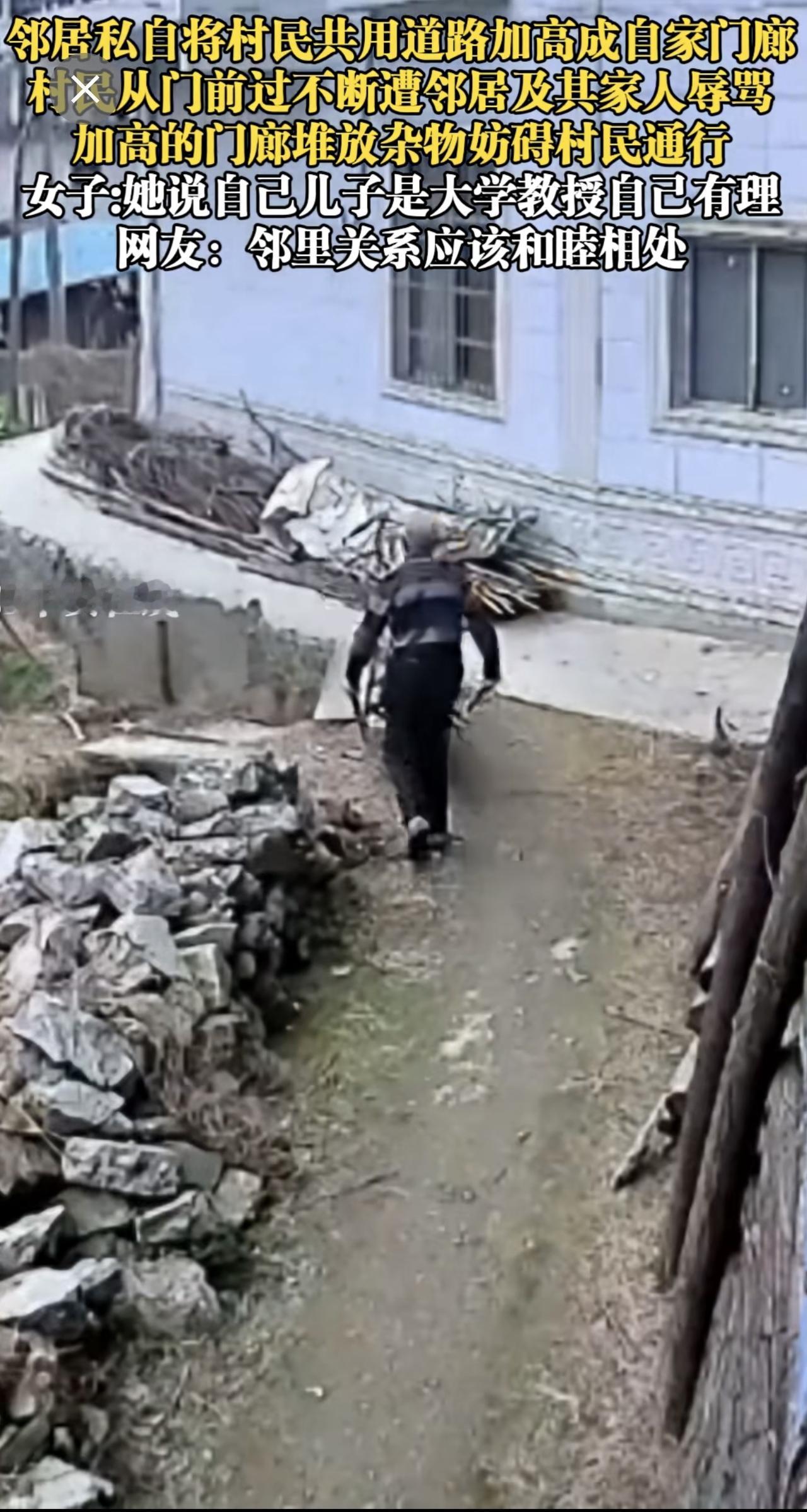 2月1日(报道时间),湖南。邻居私自将村民共用道路加高成自家门廊,村民从门前过不断遭邻居及其家人辱骂,加高的门廊堆放杂物妨碍村民通行,女子:她说自己儿子是大学教授自己有理,网友:邻里关系应该和睦相处(陈三多)投稿邮箱:3882124142@qq.com;更多视频点击关注@中安在线