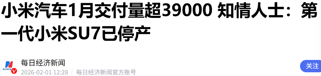 电动知家消息,2月1日,据每日经济新闻等多家媒体报道,据知情人士透露,第一代小米SU7已停产。2月1日,小米汽车也公布了2026年1月的交付数据,小米汽车1月交付量超3.9万辆。