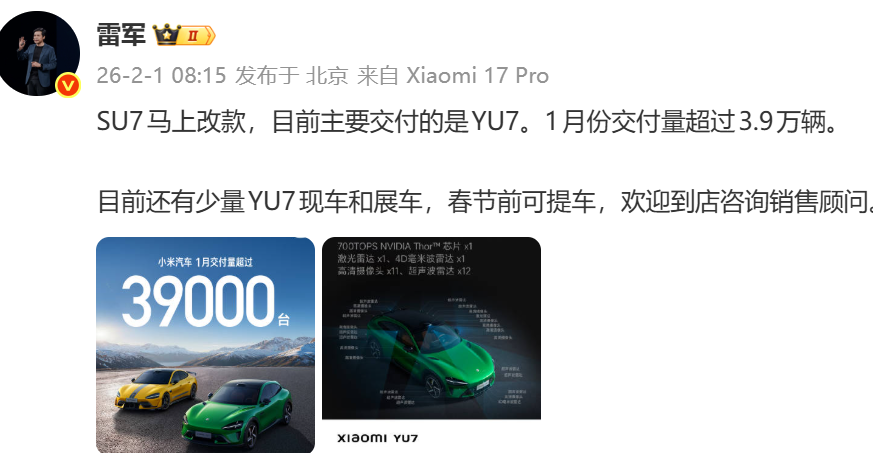 对于第一代小米SU7停产的消息,雷军发布的消息似乎也印证了这一说法。2月1日,雷军发布了1月小米汽车交付信息,同时表示,SU7马上改款,目前主要交付的是YU7。虽然小米汽车2026年1月交付量较2025年12月超5万辆的交付水平出现明显回落,环比降幅超过20%,但是1月是整个汽车行业的淡季,小米汽车主要交付仅靠1款车型(小米YU7)能有这成绩已是相当不错。