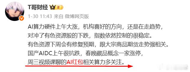 这周我多次提醒过关注AI红包和国产AIDC方向,随着春节临近,市场的反应可能会越发明显,下周仍保持关注