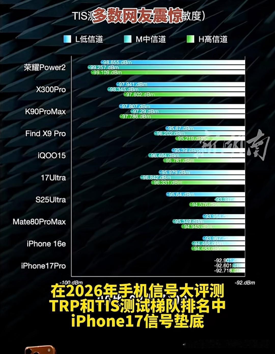 一名叫“阿正很硬”的博主对当下热门手机进行了信号测试,结果发现iPhone17信