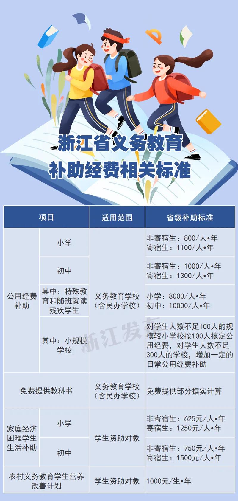 《管理办法》明确,补助经费主要用于公用经费补助、免费提供教科书、家庭经济困难学生生活补助等。其中,公用经费补助,是指用于保障义务教育学校正常运转、完成教育教学活动和与教学相关的后勤服务等方面支出的财政补助;家庭经济困难学生生活补助,是指对就读义务教育学校,纳入学生资助对象的学生给予的生活补助,补助标准为非寄宿小学生每生每年625元,寄宿小学生每生每年1250元,非寄宿初中生每生每年750元,寄宿初中生每生每年1500元。