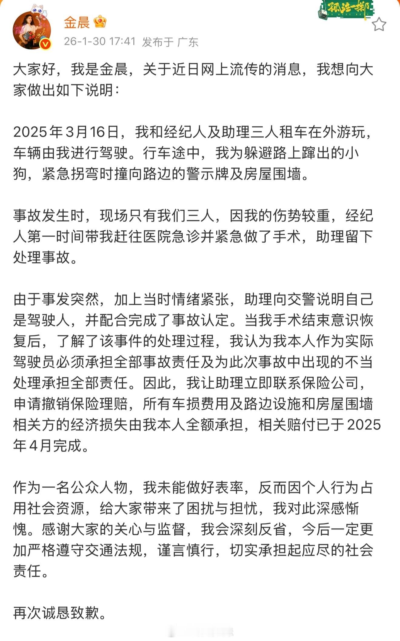 狗仔说金晨事故认定书没有狗的事儿 狗仔晒金晨2025年3月的交通事故认定书,说当