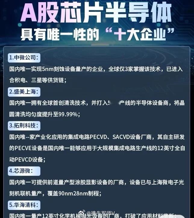 A股芯片半导体具有唯一性的“十大企业”核心信息总结(按排名顺序):1-5名中微公