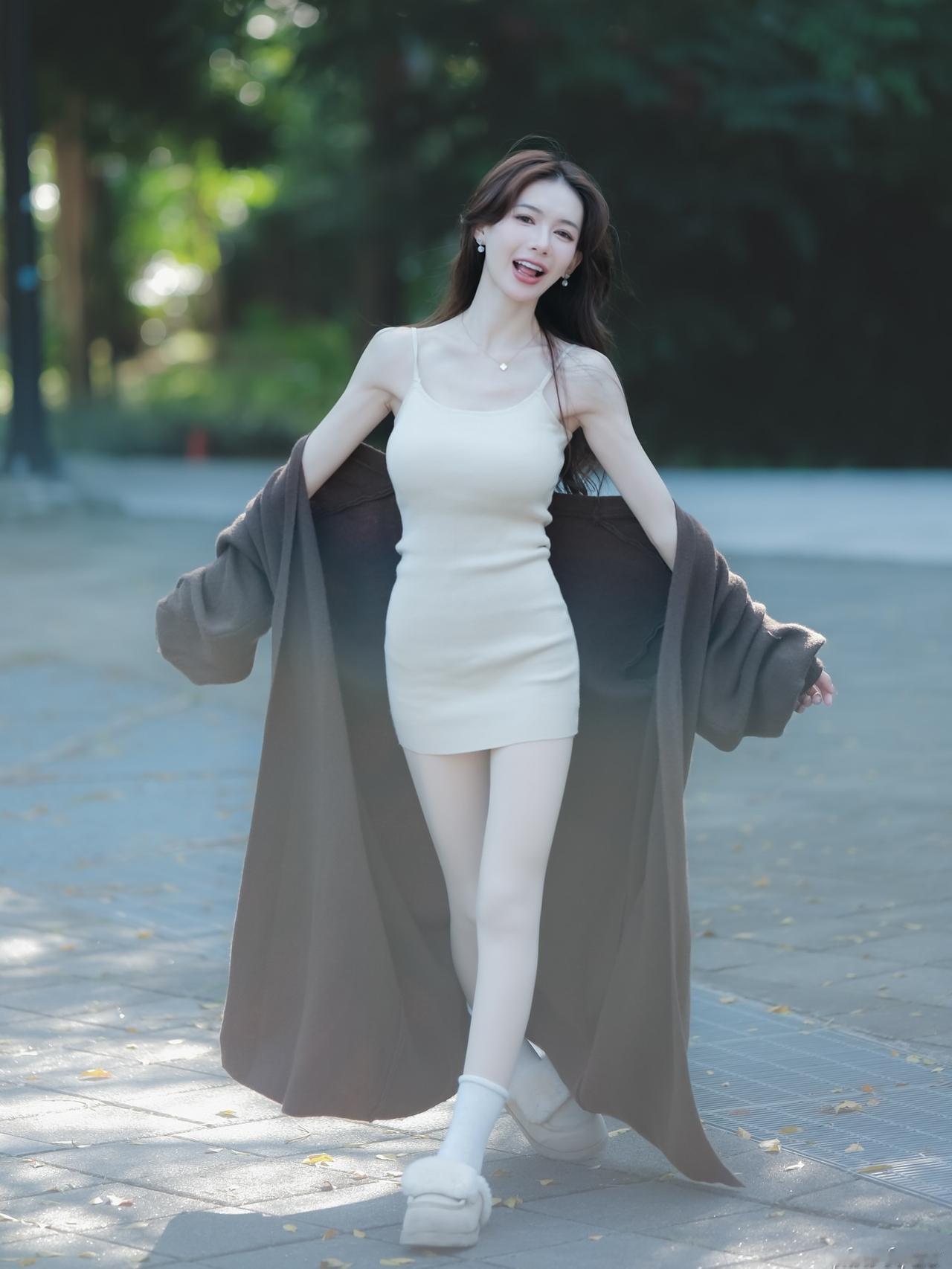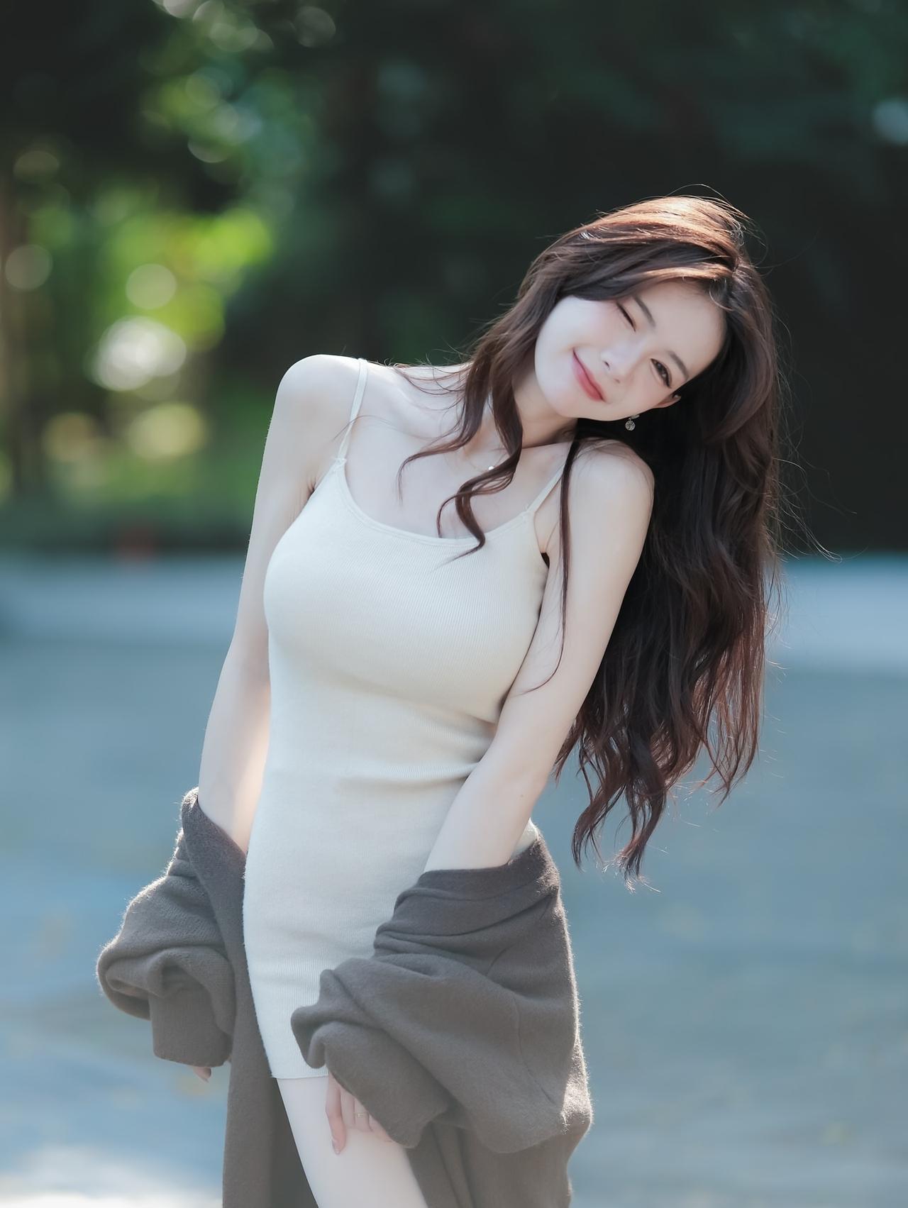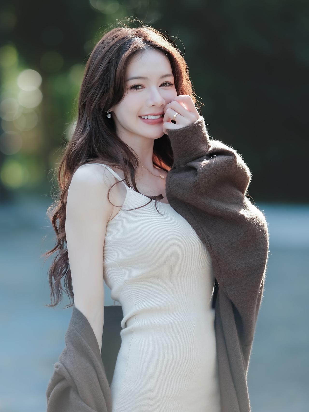 阳光下的温柔微笑,长卷发随风飘逸,简约穿搭尽显自然美。